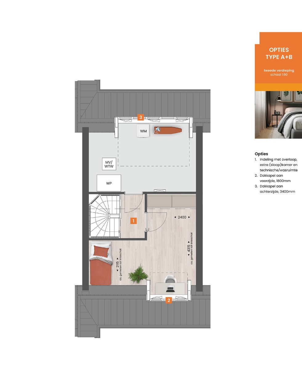 Op de eerste verdieping kun je bijvoorbeeld kiezen voor het vergroten van de badkamer om ruimte te maken voor een ligbad door te kiezen voor een apart toilet of door het samenvoegen van slaapkamers tot één grote slaapkamer. En op de tweede verdieping creëer je o.a. meer ruimte met een dakkapel en/of enkele dakramen voor een grote (slaap)kamer of speelkamer of een thuiskantoor.