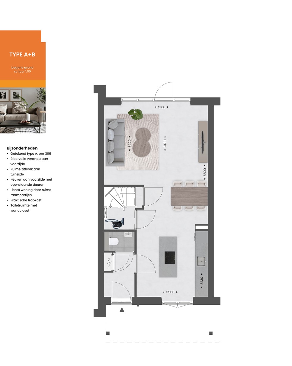 Er zijn meerdere mogelijkheden om deze woning helemaal naar wens aan te passen via opties. Zo creëer je bijvoorbeeld een extra ruime woonkamer door een uitbouw aan de achterzijde van 1.20m of 2.40m of verbind je binnen meer met buiten door de optie voor openslaande tuindeuren of een schuifpui. Of verplaats de keuken naar het midden van de woning of naar de achterzijde om een extra grote leefkeuken te creëren.