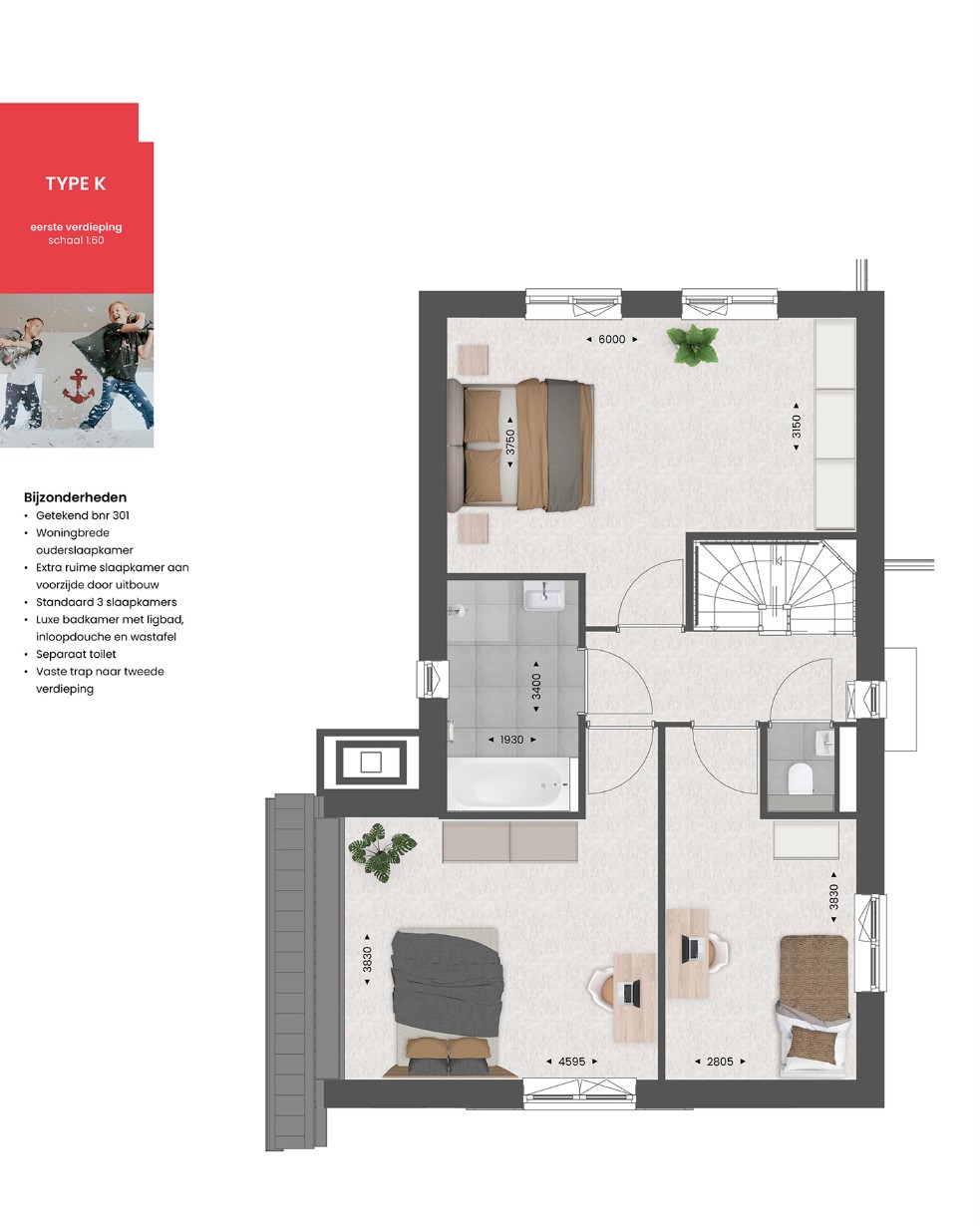 Ook de verdiepingen zijn naar wens in te delen. Op de eerste verdieping kun je de badkamer vergroten voor meer comfort, of twee slaapkamers samenvoegen tot één royale hoofdslaapkamer met bijv. een inloopkast. Op de tweede verdieping richt je met diverse indelingsopties een volwaardige woonlaag in, met bijvoorbeeld twee extra slaapkamers, een tweede badkamer en een praktische was-/bergruimte.