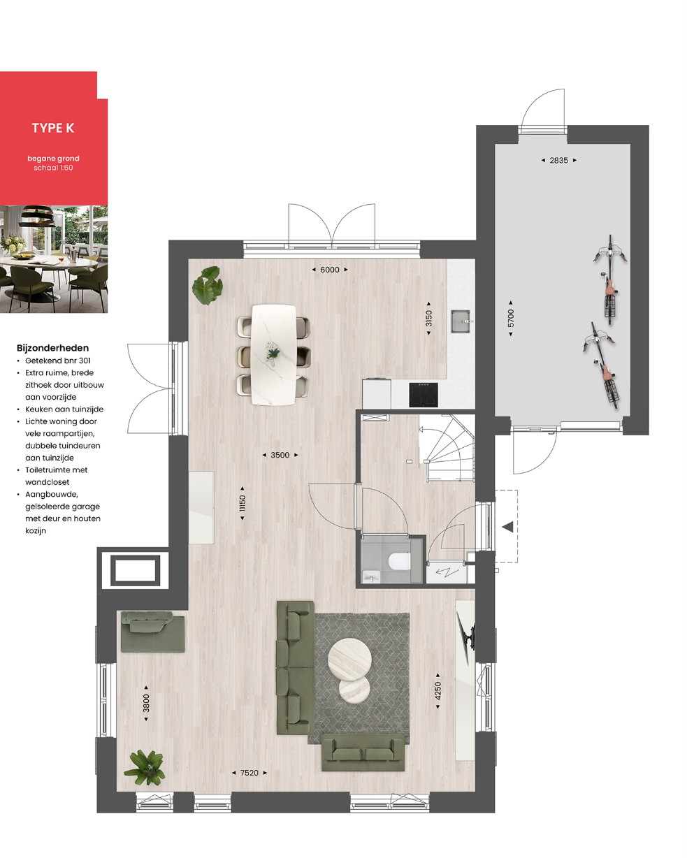 Er zijn volop mogelijkheden om deze woning naar jouw wensen aan te passen. Op de begane grond kun je kiezen voor een uitbouw van 1,20 of 2,40 meter, waarmee je direct meer leefruimte creëert. Wil je liever de keuken aan de voorzijde? Ook dat is mogelijk. Daarnaast kun je de garage verlengen en/of opsplitsen in een berging en een extra ruimte die je bij de woning betrekt – ideaal voor bijvoorbeeld een werkkamer, speelruimte of hobbyruimte.