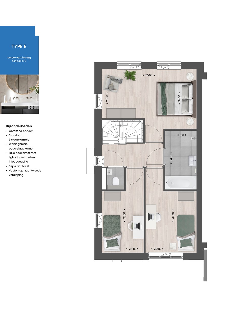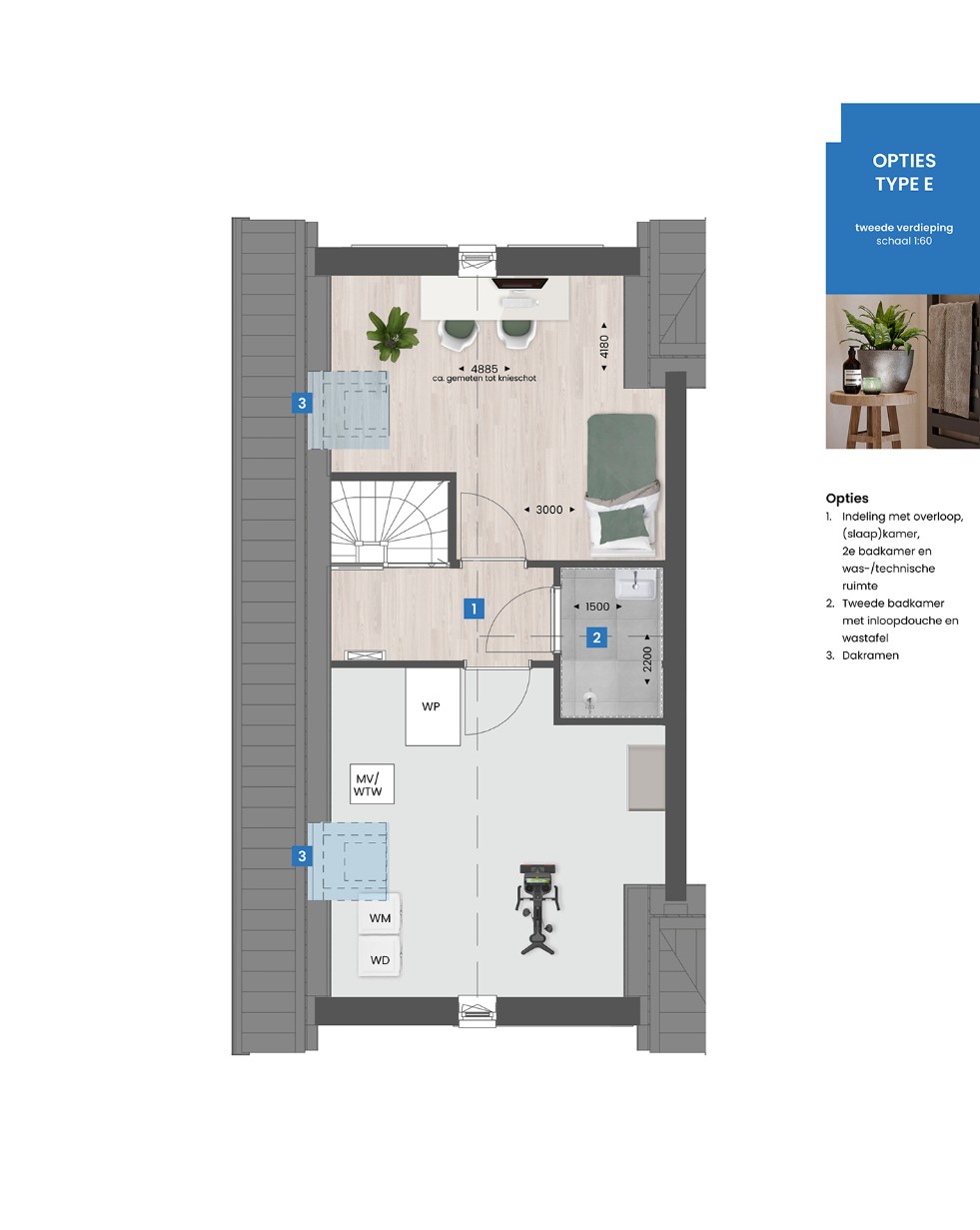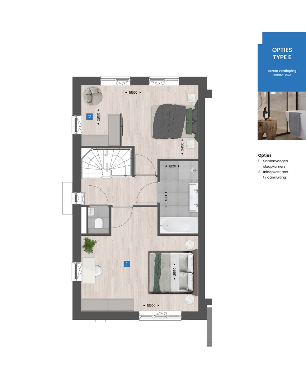 Ook de verdiepingen zijn naar wens in te delen. Op de eerste verdieping kun je de badkamer vergroten voor meer comfort, of twee slaapkamers samenvoegen tot één royale hoofdslaapkamer met bijv. een inloopkast. Op de tweede verdieping richt je met diverse indelingsopties een volwaardige woonlaag in, met bijvoorbeeld twee extra slaapkamers, een tweede badkamer en een praktische was-/bergruimte.