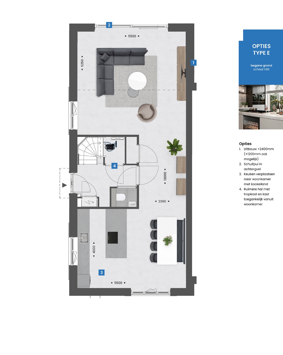Er zijn volop mogelijkheden om deze woning naar jouw wensen aan te passen. Op de begane grond kun je kiezen voor een uitbouw van 1,20 of 2,40 meter, waarmee je direct meer leefruimte creëert. Wil je liever de keuken aan de voorzijde? Ook dat is mogelijk.