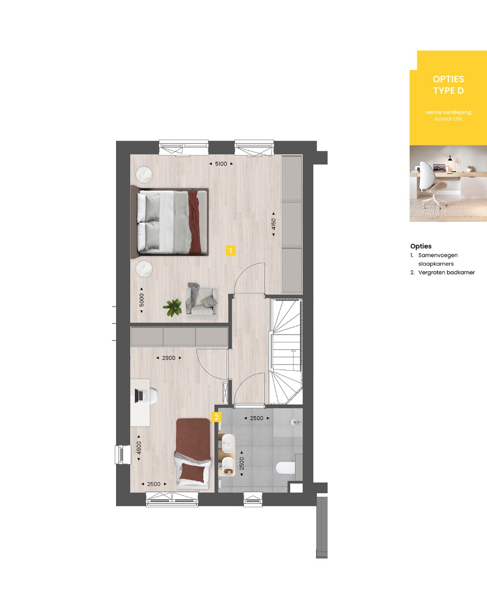 Op de eerste verdieping kun je de badkamer vergroten, zodat er bijvoorbeeld ruimte ontstaat voor een ligbad. Of combineer twee slaapkamers tot één royale hoofdslaapkamer.