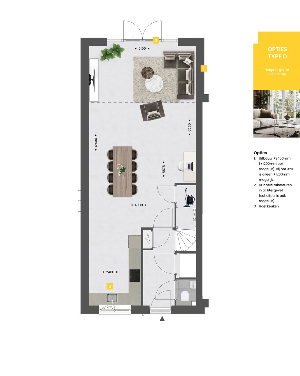 Met de beschikbare opties geef je jouw nieuwe woning eenvoudig een persoonlijke touch. Denk bijvoorbeeld aan een extra ruime woonkamer dankzij een uitbouw van 1,20 of zelfs 2,40 meter aan de achterzijde. Wil je meer verbinding tussen binnen en buiten? Kies dan voor openslaande tuindeuren of een schuifpui.