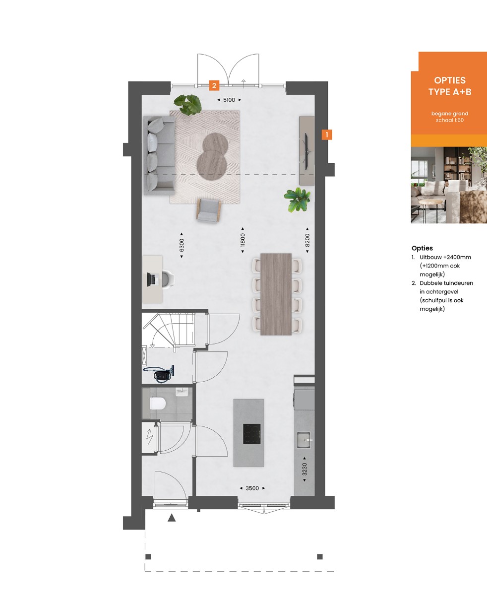 Er zijn meerdere mogelijkheden om deze woning helemaal naar wens aan te passen via opties. Zo creëer je bijvoorbeeld een extra ruime woonkamer door een uitbouw aan de achterzijde van 1.20m of 2.40m of verbind je binnen meer met buiten door de optie voor openslaande tuindeuren of een schuifpui. Of verplaats de keuken naar het midden van de woning of naar de achterzijde om een extra grote leefkeuken te creëren.