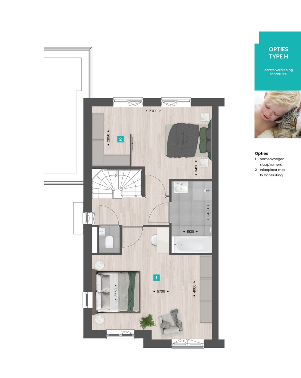 Ook de verdiepingen zijn naar wens in te delen. Op de eerste verdieping kun je de badkamer vergroten voor meer comfort, of twee slaapkamers samenvoegen tot één royale hoofdslaapkamer met bijv. een inloopkast. Op de tweede verdieping richt je met diverse indelingsopties een volwaardige woonlaag in, met bijvoorbeeld twee extra slaapkamers, een tweede badkamer en een praktische was-/bergruimte.