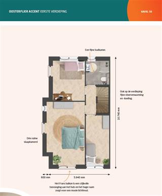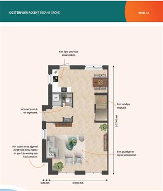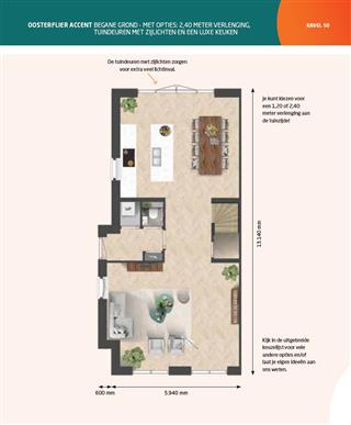 De hoekwoning (kavel 50) van het woningmodel Oosterflier is in de basis 5,94 meter breed en 10.74 meter diep. Het accent in de zijgevel zorgt niet alleen voor extra ruimte, maar geeft de woning ook een stijlvolle uitstraling. Aan de straatzijde is er ruimte voor een sfeervolle zithoek. De tuinzijde is de ideale plek voor je nieuwe keuken. Door te kiezen voor een uitbouw van 1,20 of 2,40 meter creëer je een royale woonkeuken met volop ruimte voor een gezellige eethoek met kookeiland. We denken graag met je mee over de indeling, inrichting en alle mogelijkheden om jouw droomkeuken werkelijkheid te maken!