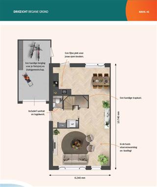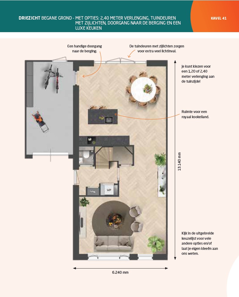 Bouwnummer 41 is in de basis 6,24 meter breed en 10,74 meter diep. De ruime en lichte woonkamer aan de voorzijde is de perfecte plek voor een gezellige zithoek. De tuinzijde is ideaal voor je toekomstige droomkeuken. Daarnaast heeft deze woning een aangebouwde gemetselde berging, erg handig. Vanuit de keuken genieten van je tuin? Kies voor tuindeuren met zijlichten en haal buiten écht naar binnen. Wil je nog meer ruimte en een prachtige royale woonkeuken? Breid je woning dan uit met een verlenging van 1,20 of 2,40 meter. Zo ontstaat een royale, lichte leefkeuken met volop mogelijkheden. We denken graag met je mee over de invulling!