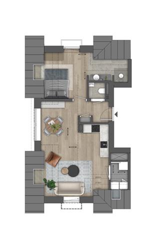 In de nok van beide gebouwen zijn 4 verrassend sfeervolle appartementen type 3 gesitueerd. Naast een gecombineerde woonkamer/keuken vind je een fijne slaapkamer met ensuite badkamer onder het schuine dak. Je beschikt over een praktische wasruimte en er is een separaat toilet.