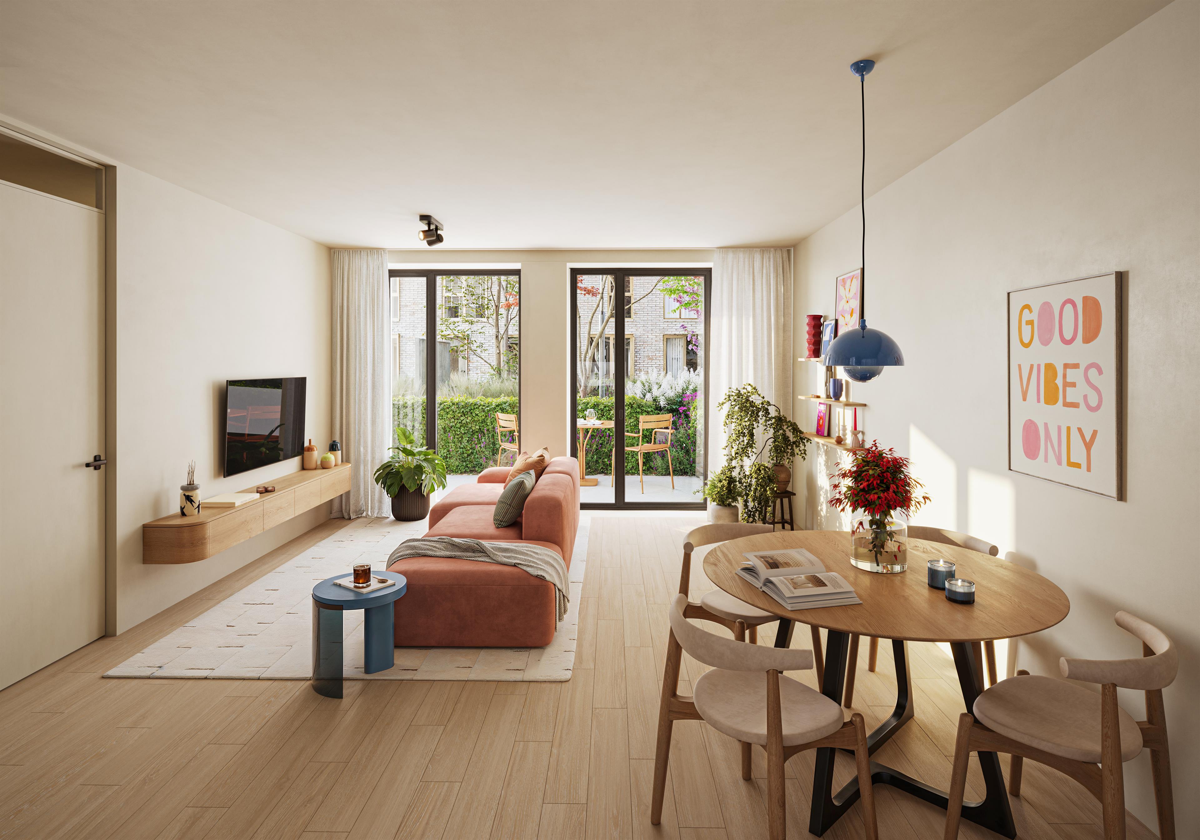 De appartementen in HONK zijn energiezuinig (A++/A+++), comfortabel en toekomstbestendig. Elk appartement heeft een eigen balkon of terras, en bewoners delen een verhoogd dakpark, groene corridor en gemeenschappelijke buitenruimtes. Parkeren doe je uit het zicht, in een ondergrondse garage of in een van de aangrenzende parkeerkoffers.