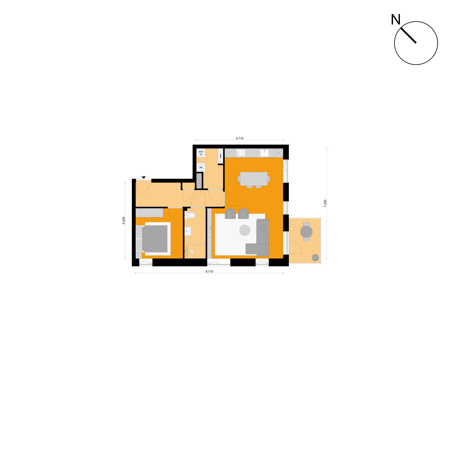 In dit tweekamerappartement kom je fijn thuis. Vanuit de hal heb je toegang tot de lichte woonkamer, het toilet en de technische ruimte met plek voor je wasmachine en extra opbergruimte. De open keuken is een gezellige plek om te koken en samen te zijn. De ruime slaapkamer biedt volop comfort en vanuit de woonkamer stap je zo naar buiten, je balkon of terras op!