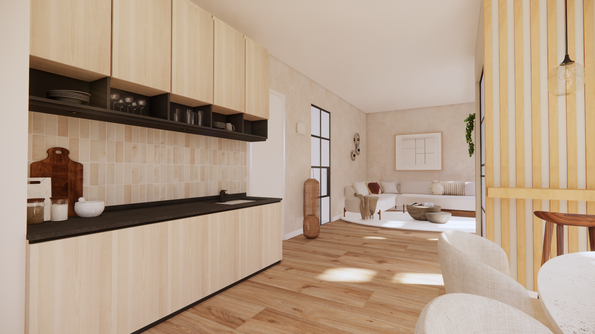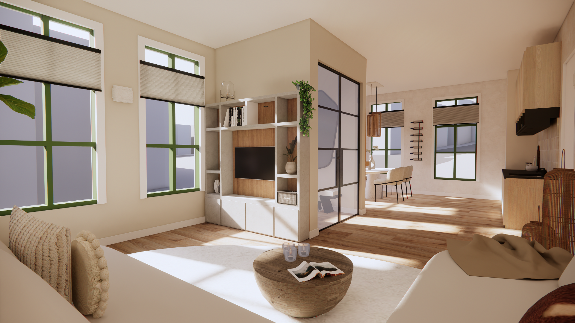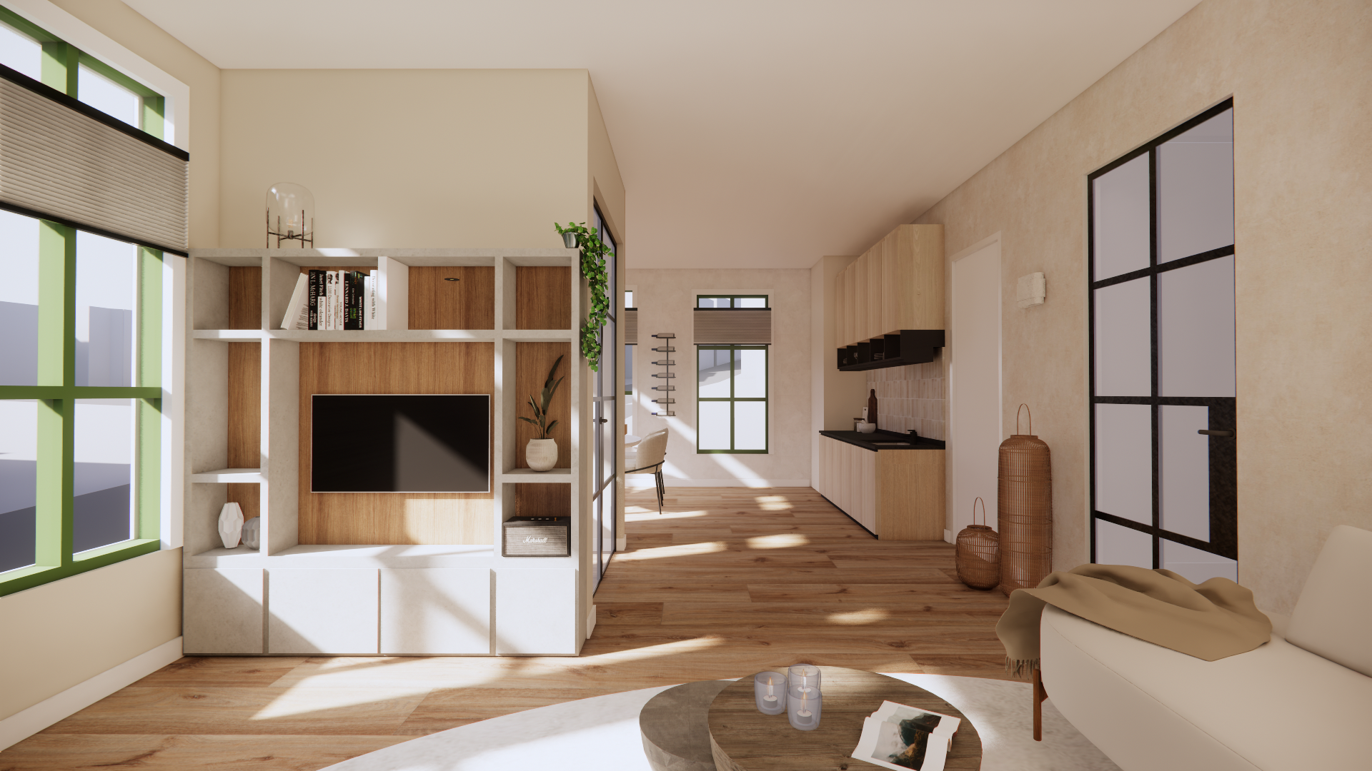 Begane grond: eigen entree aan de voorzijde. Hal. Dubbele openslaande deuren naar living met aansluitende (casco op te leveren) leefkeuken. Bijkeuken met opstelling installaties en aansluitingen wasmachine en -droger. Gang. Toiletruimte. Badkamer met inloopdouche en wastafel met spiegel. Slaap- annex werkkamer. Hoofdslaapkamer met openslaande deur naar terras en zijtuin.