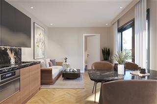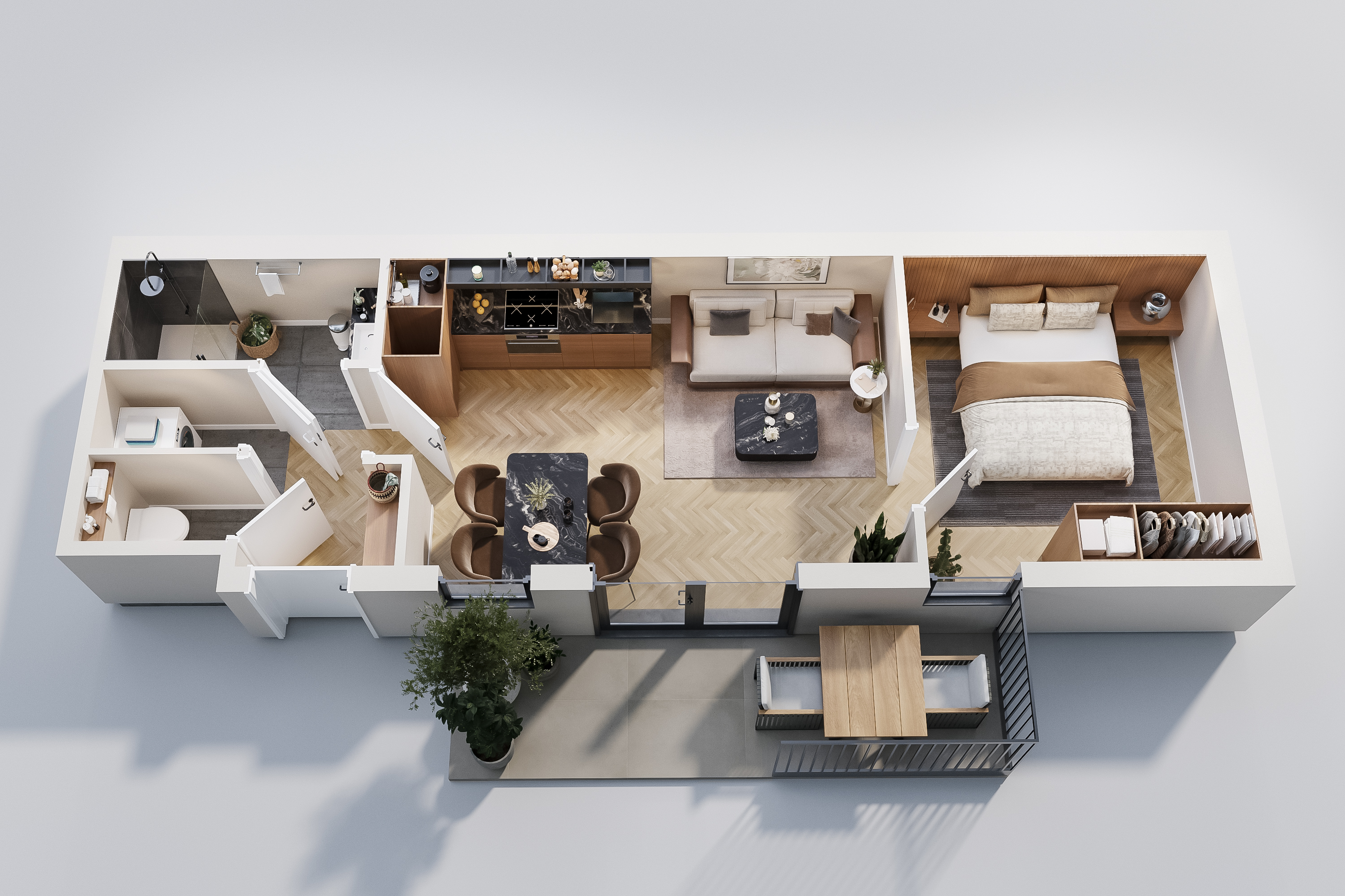 Dit tweekamerappartement bevindt zich in de stenen uitbouw van het oorspronkelijke pand en wordt compleet gerenoveerd. Deze compacte woning heeft één slaapkamer, perfect voor singles of stellen. De buitenruimte ligt aan de entree, met zicht op de binnenplaats. De (casco op te leveren) open leefkeuken is heerlijk licht en ruim. De slaapkamer heeft de badkamer en-suite. Het separate toilet bevindt zich in de hal. Moderne installaties en WTW vormen vaste ingrediënten voor lage energiekosten en minimale belasting van milieu, natuur en klimaat.