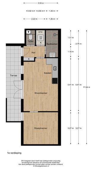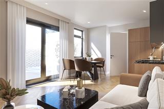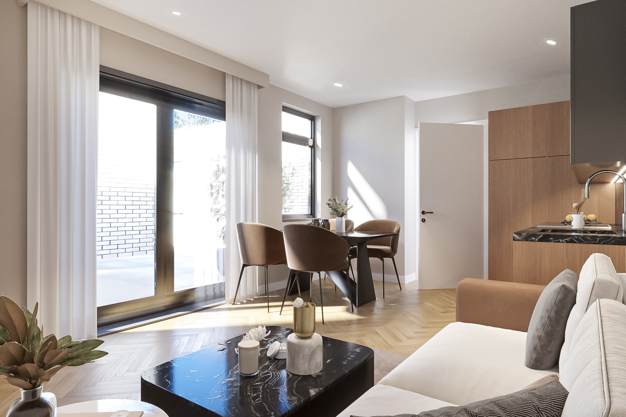 Appartement: entree. Hal. Toiletruimte. Berging met aansluitingen wasmachine en -droger. Installaties (onder meer WTW). Badkamer met inloopdouche en wastafel. Lichte living met dubbele openslaande deuren naar de buitenruimte. Voorzieningen voor een open L-vormige keuken. Slaapkamer (12 m2).