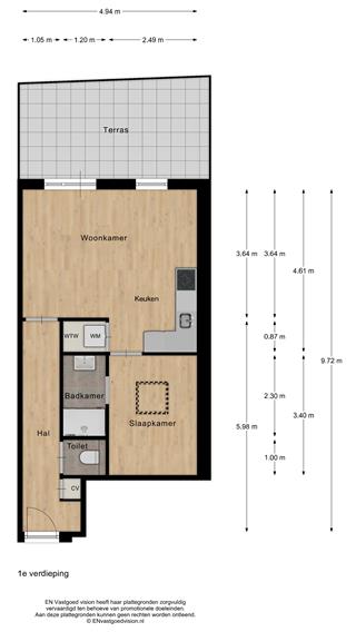 Appartement: entree. Gang. Toiletruimte. Lichte L-vormige living met openslaande deur naar zonnig dakterras van 15 m2. Voorzieningen voor een open hoekkeuken. Berging met aansluitingen wasmachine en -droger. Installaties (onder meer WTW). Slaapkamer met en-suite badkamer, met inloopdouche en wastafel.