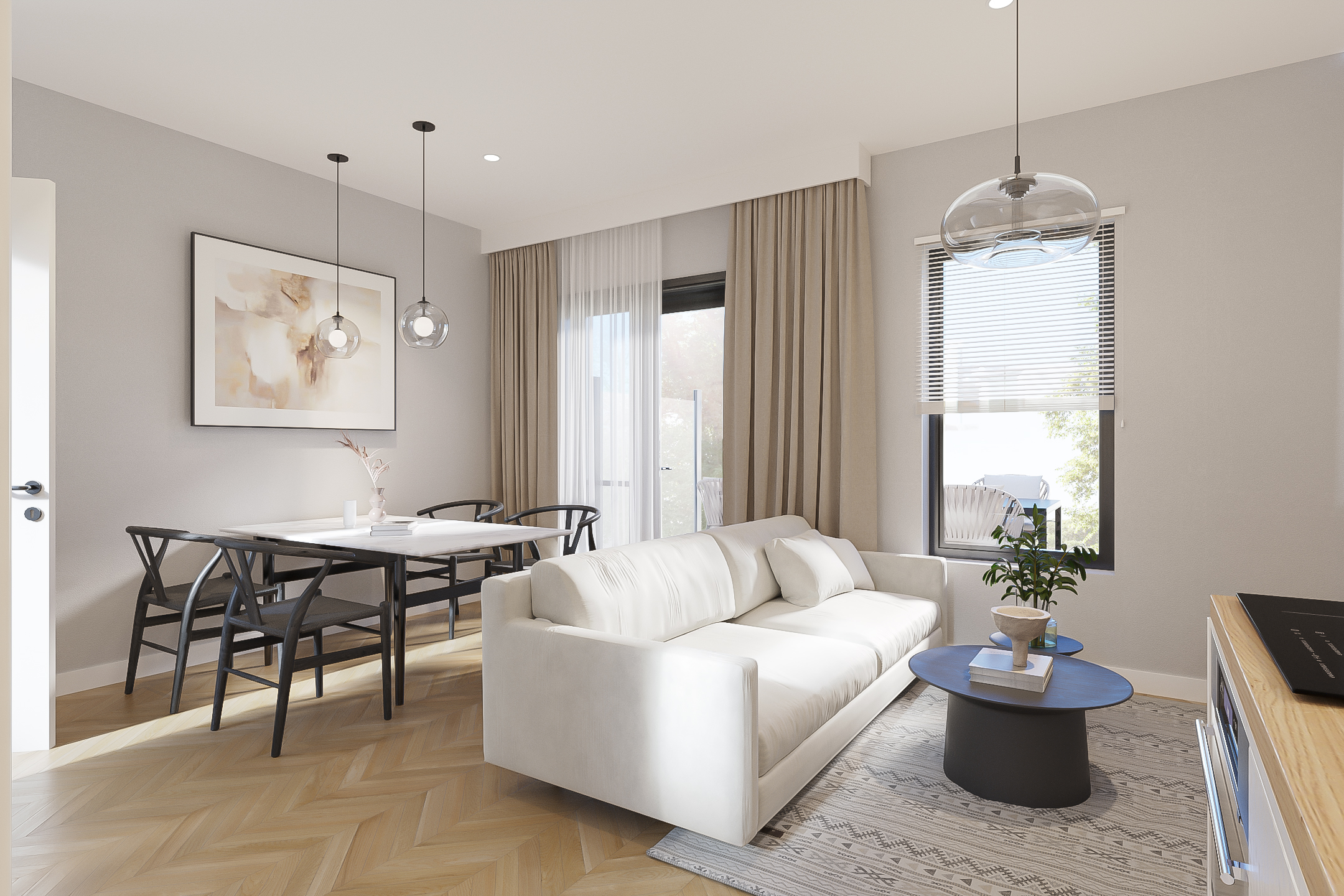 Dit tweekamerappartement wordt compleet nieuw gerealiseerd, bovenop de gezamenlijke parkeergarage. Dit is een compacte woning met één slaapkamer, perfect voor singles of stellen. Vóór delen de appartementen een diepe galerij, achter zit je lekker beschut. De woning beschikt over 15 m2 privé buitenruimte, op het zonnige zuidoosten. Met een openslaande deur en grote raampartijen worden binnen en buiten verbonden. De living met (casco op te leveren) open leefkeuken is heerlijk licht en ruim. De slaapkamer heeft de badkamer en-suite. Het separate toilet bevindt zich in de hal. Moderne installaties en WTW vormen vaste ingrediënten voor lage energiekosten en minimale belasting van milieu, natuur en klimaat.