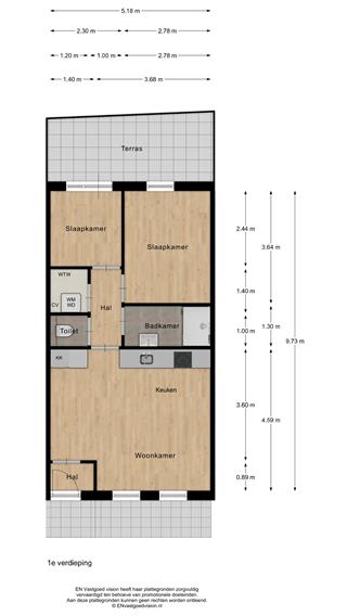 Verdieping: brede galerij met eigen buitenruimte (5 m2) pal voor dit appartement.