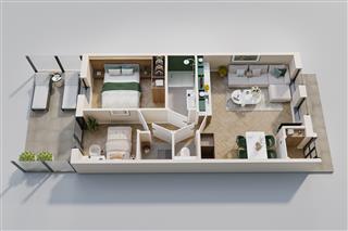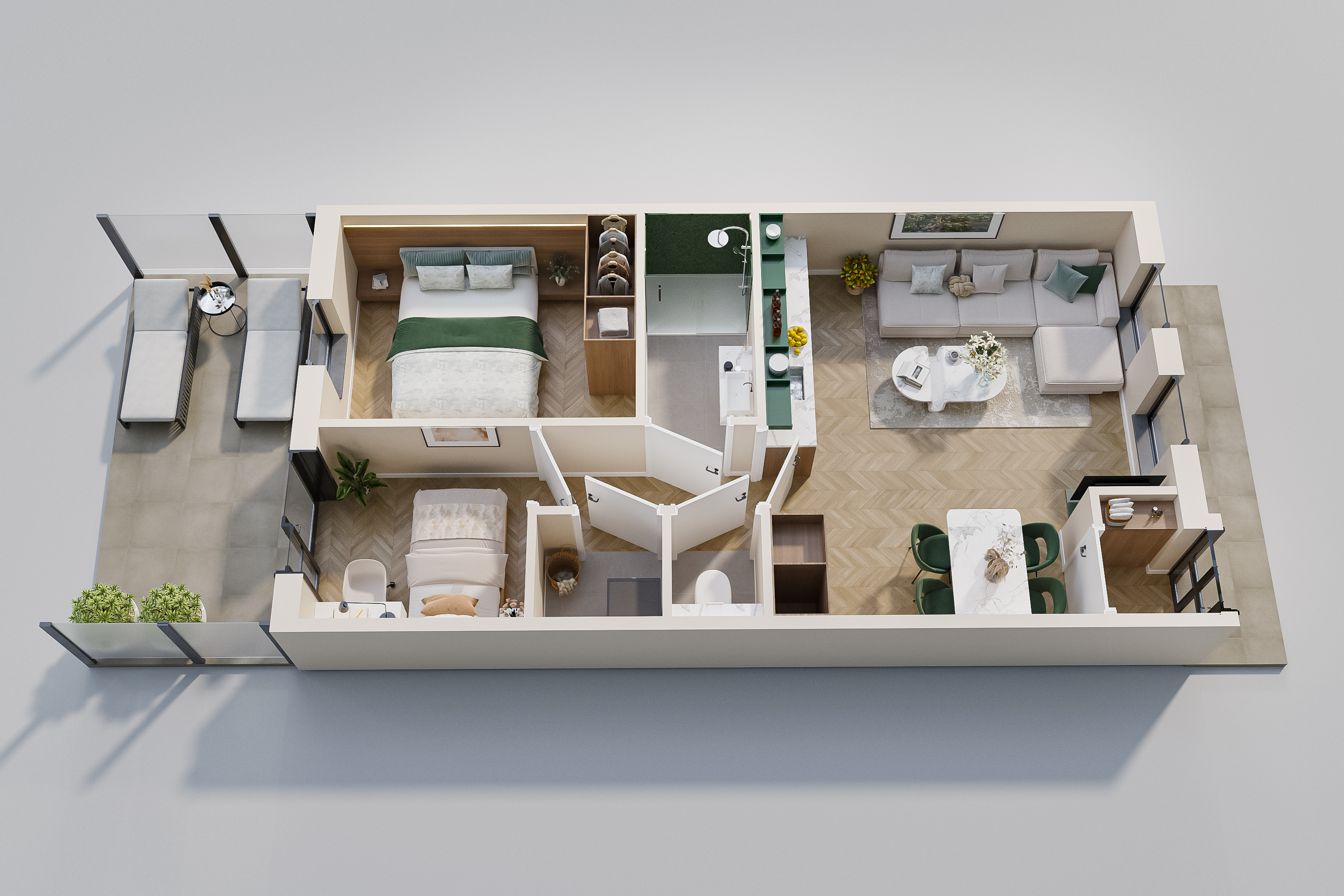 Dit driekamerappartement wordt compleet nieuw gerealiseerd, bovenop de gezamenlijke parkeergarage. Dit appartement grenst met de woonkamer en (casco op te leveren) open keuken aan de eigen buitenruimte op de westkant. Achter zit je lekker beschut op een dakterras van 12 m2. De slaap-/ annex werkkamer heeft een openslaande deur naar dit privé terras. De andere slaapkamer is met ruim 10 m2 het grootst.