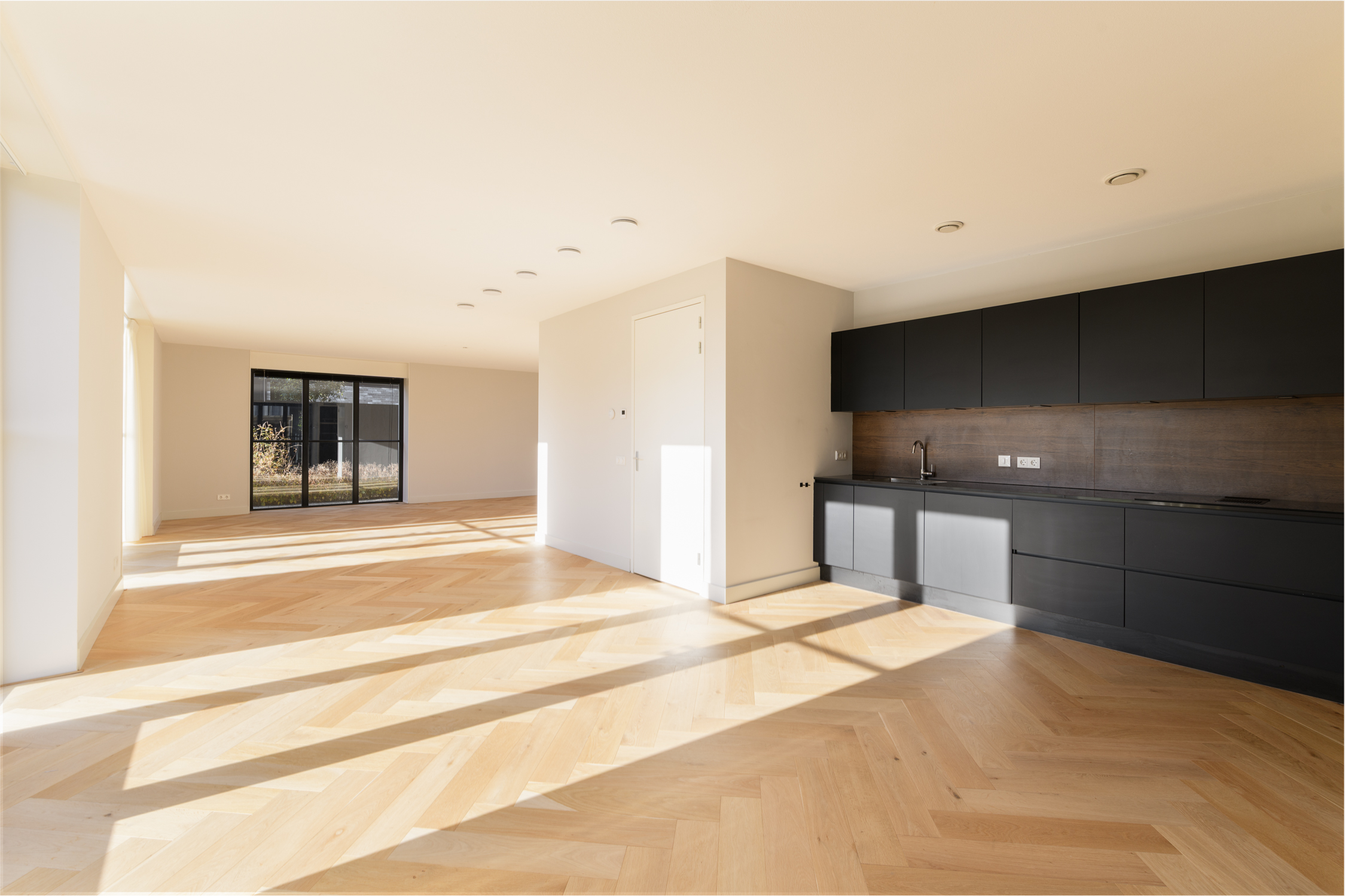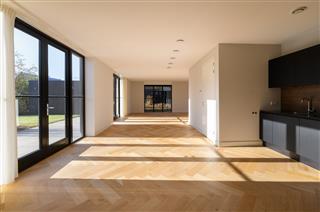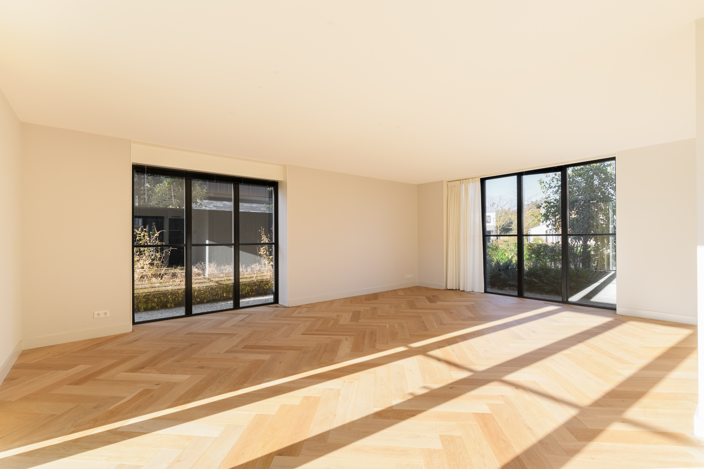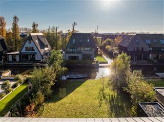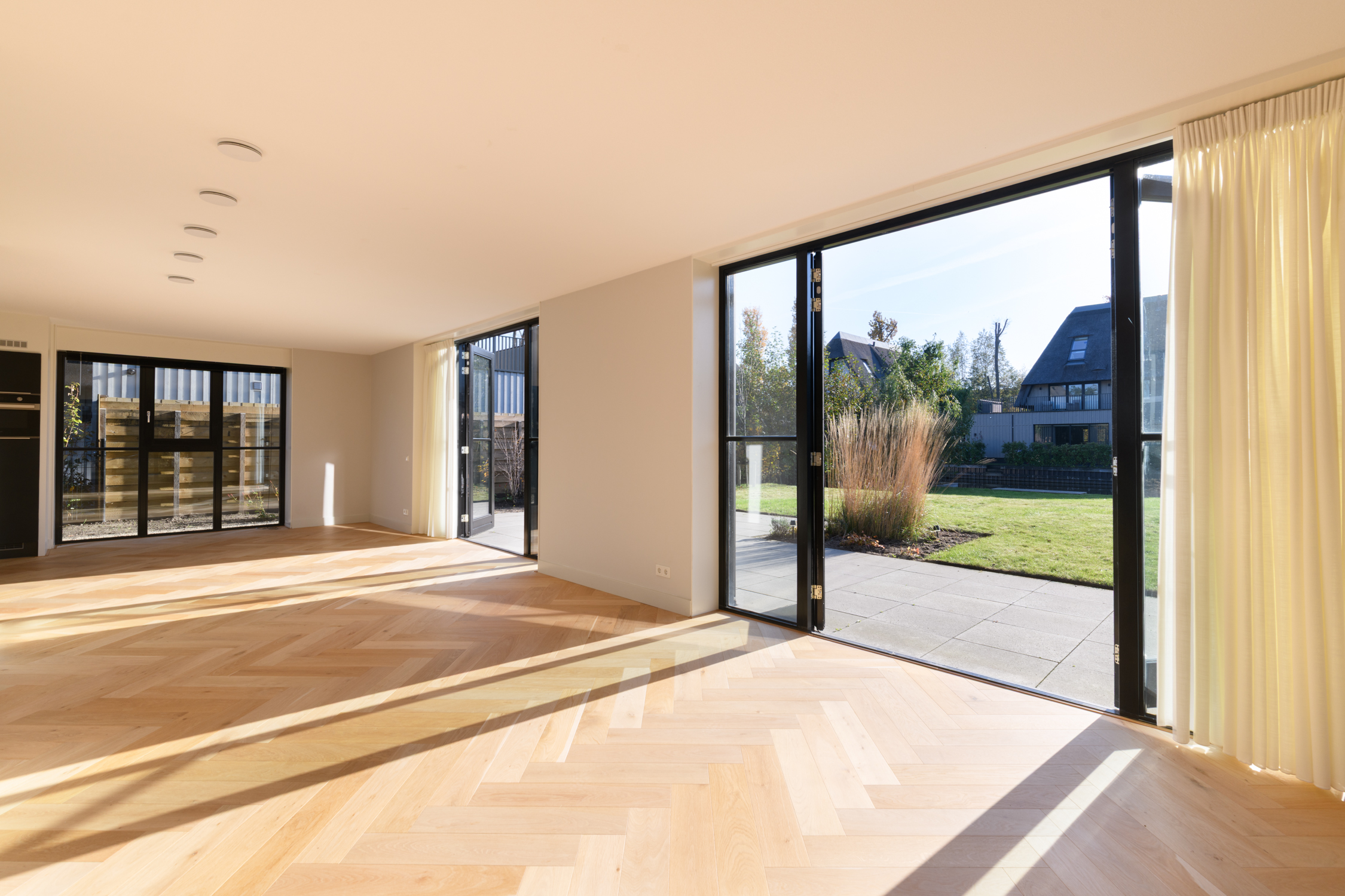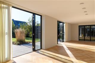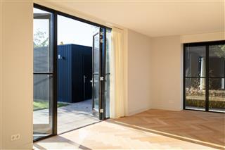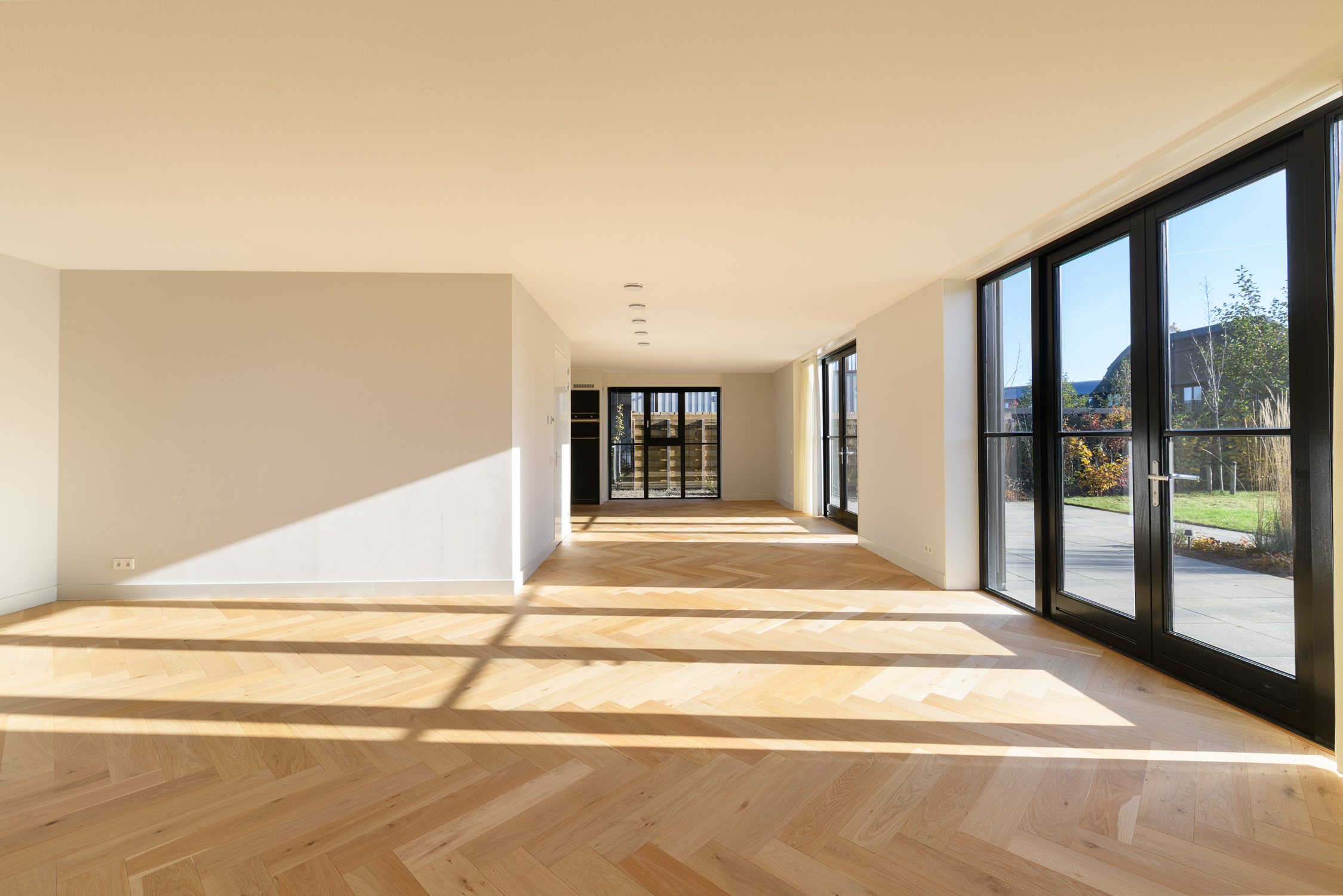 Tuingerichte woonkamer naar boven Tuingerichte woonkamer Met prachtig lichtinval Heerlijk ruim en licht De woonkamer is een heerlijke lichte ruimte dankzij de grote openslaande deuren aan de achterzijde en de royale raampartijen aan de zijkant. De visgraatvloer met vloerverwarming voelt comfortabel en stijlvol tegelijk. Elke ruimte heeft een eigen thermostaat, waardoor je altijd de perfecte temperatuur creëert. Vanuit de woonkamer kijk je prachtig uit over de zij-, voor- en achtertuin én richting de watergang. De directe toegang tot de tuin maakt dit een fijne plek voor relaxte avonden, etentjes en het dagelijkse gezinsleven. Hier komen licht, ruimte en sfeer harmonieus samen.