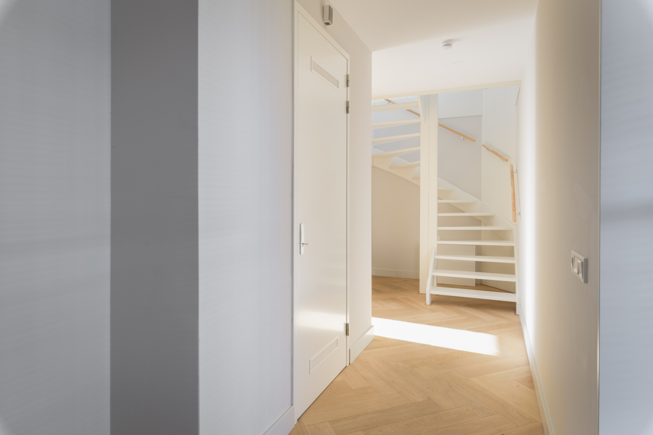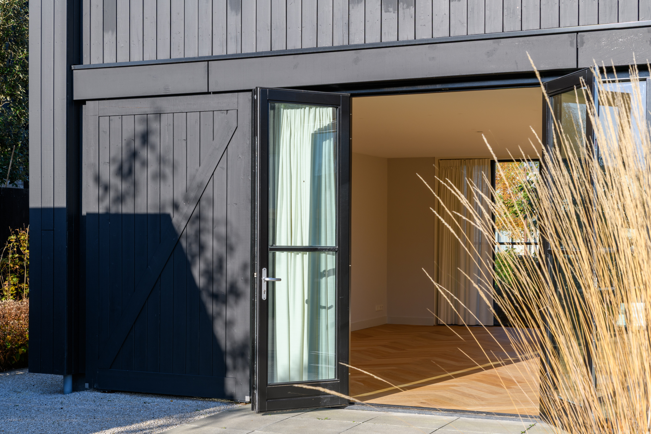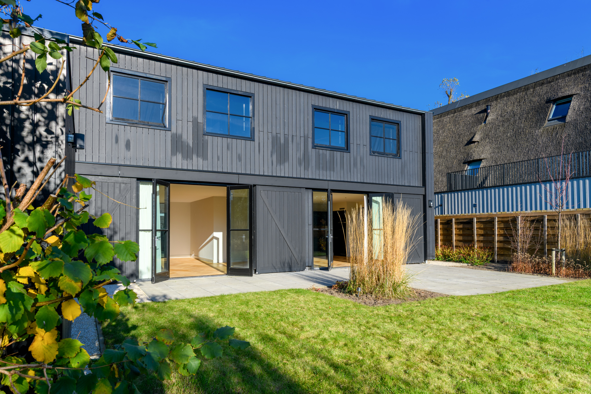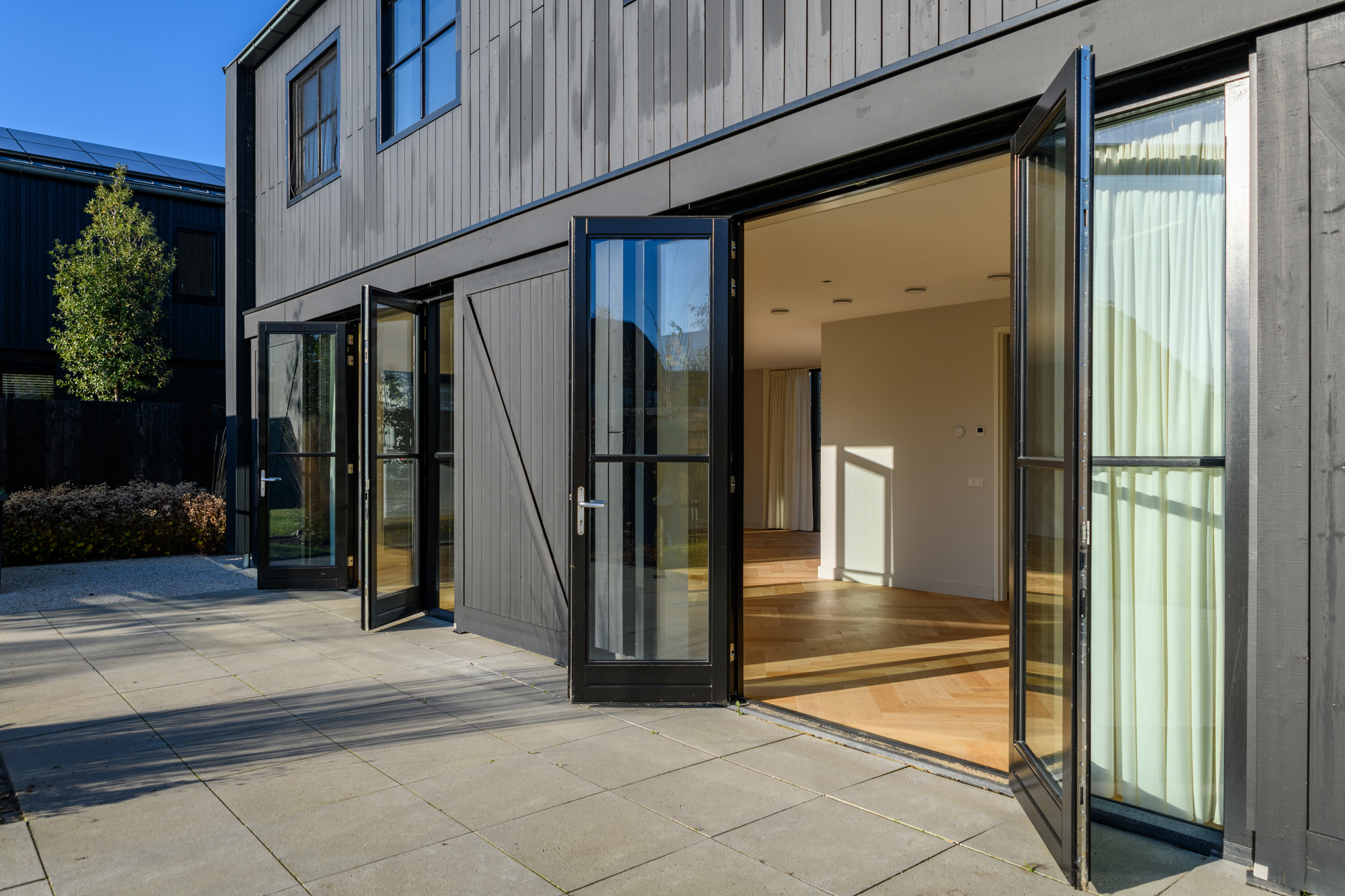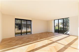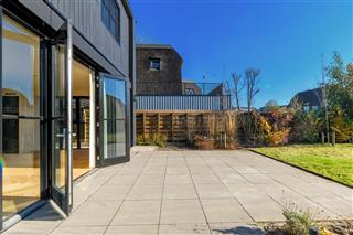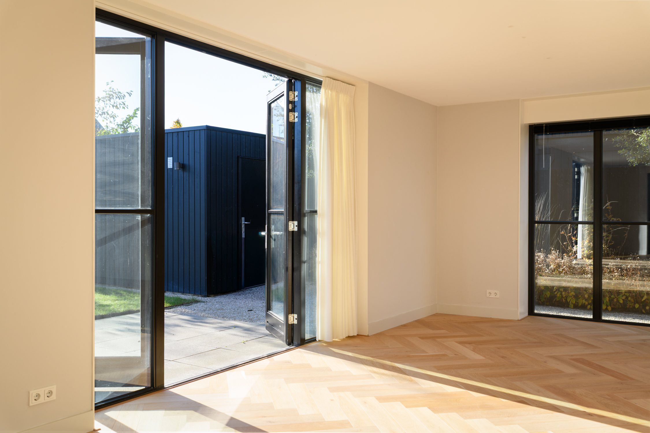 Tuingerichte woonkamer naar boven Tuingerichte woonkamer Met prachtig lichtinval Heerlijk ruim en licht De woonkamer is een heerlijke lichte ruimte dankzij de grote openslaande deuren aan de achterzijde en de royale raampartijen aan de zijkant. De visgraatvloer met vloerverwarming voelt comfortabel en stijlvol tegelijk. Elke ruimte heeft een eigen thermostaat, waardoor je altijd de perfecte temperatuur creëert. Vanuit de woonkamer kijk je prachtig uit over de zij-, voor- en achtertuin én richting de watergang. De directe toegang tot de tuin maakt dit een fijne plek voor relaxte avonden, etentjes en het dagelijkse gezinsleven. Hier komen licht, ruimte en sfeer harmonieus samen.
