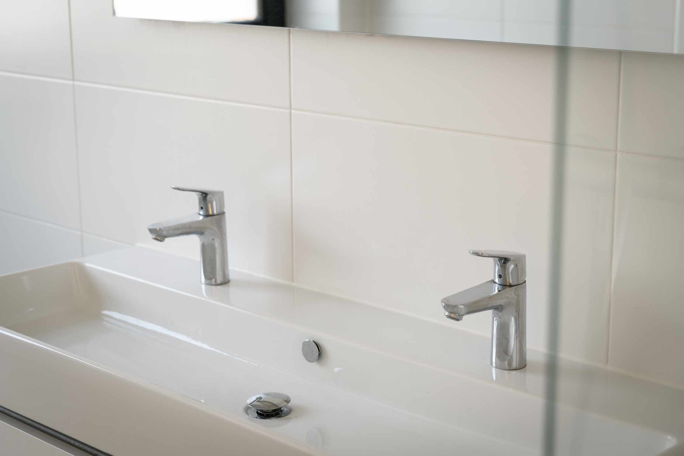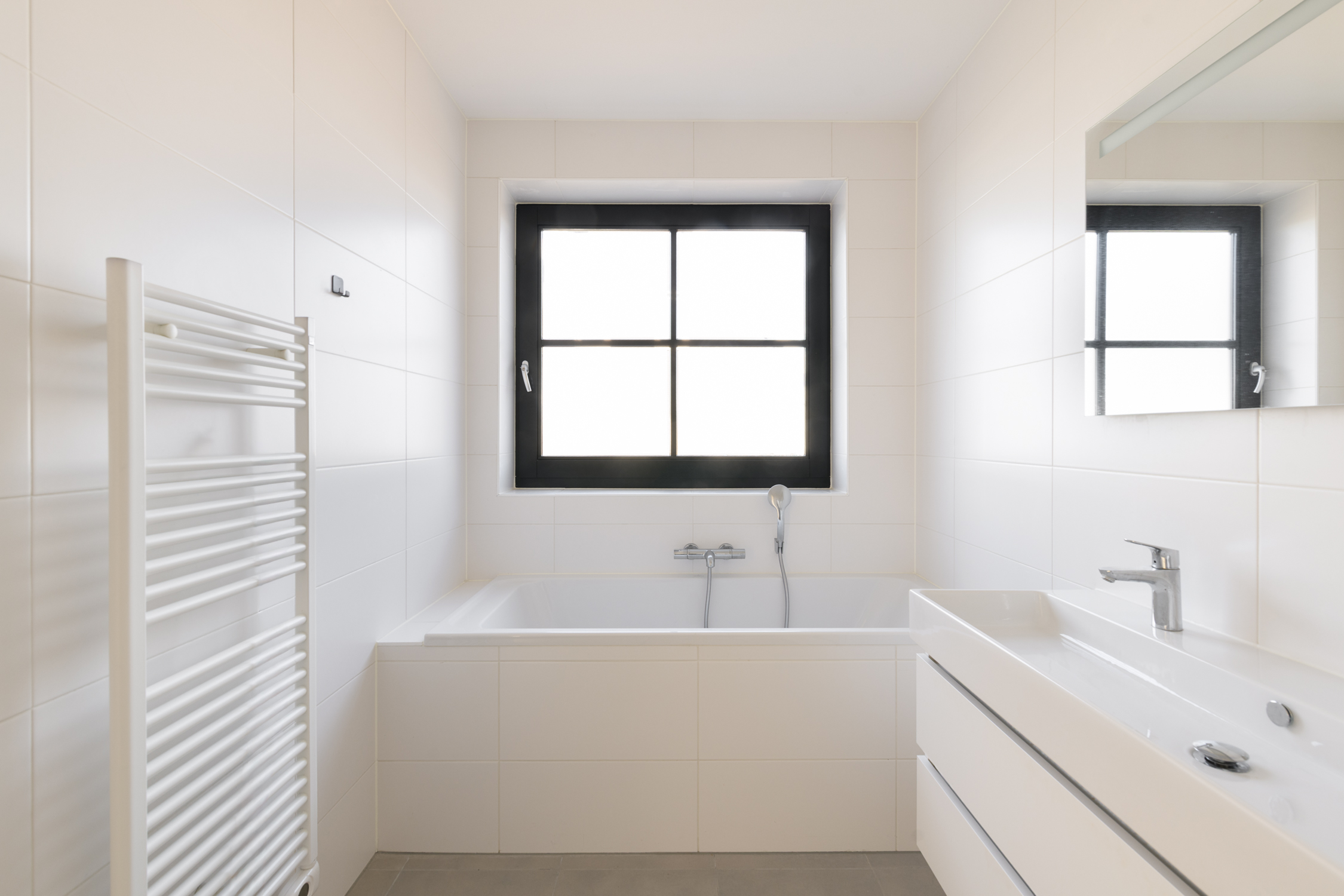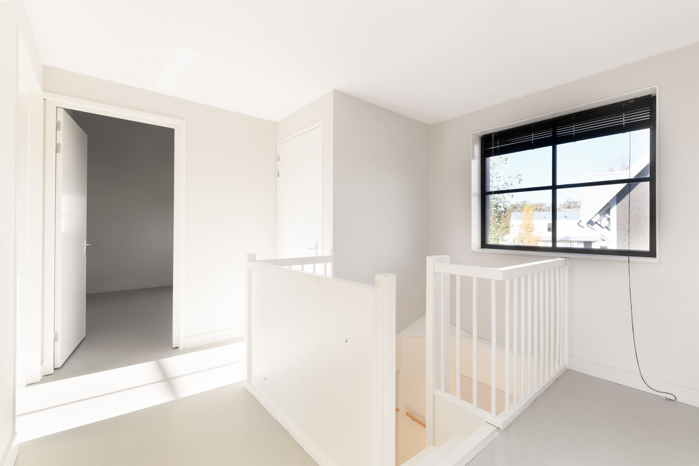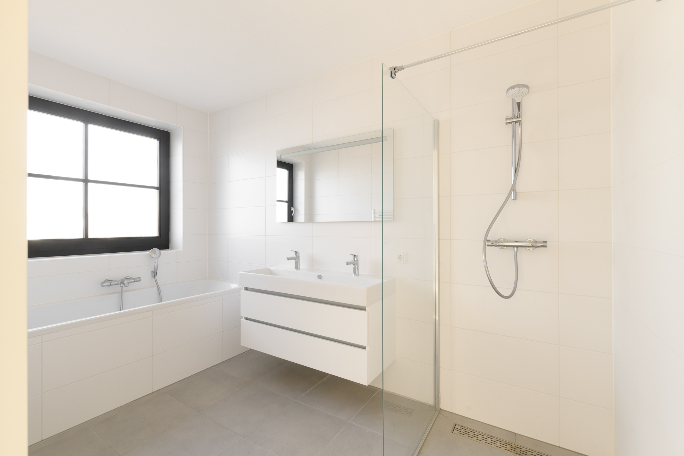 4 royale slaapkamers naar boven 4 royale slaapkamers Nette afwerking 4 lichte slaapkamers Op de eerste verdieping vind je vier ruime slaapkamers met een lichte gietvloer en vloerverwarming. Elke kamer heeft een eigen thermostaat, wat zorgt voor comfort op maat. De luxe badkamer is modern afgewerkt met een inloopdouche, ligbad en een dubbel wastafelmeubel. Het aparte toilet op de gang is praktisch voor gezinnen. Daarnaast is er een berging met de warmtepomp, WTW-installatie en wasmachineaansluiting: netjes weggewerkt en toch goed bereikbaar. De perfecte verdieping voor rust, ruimte en gemak.