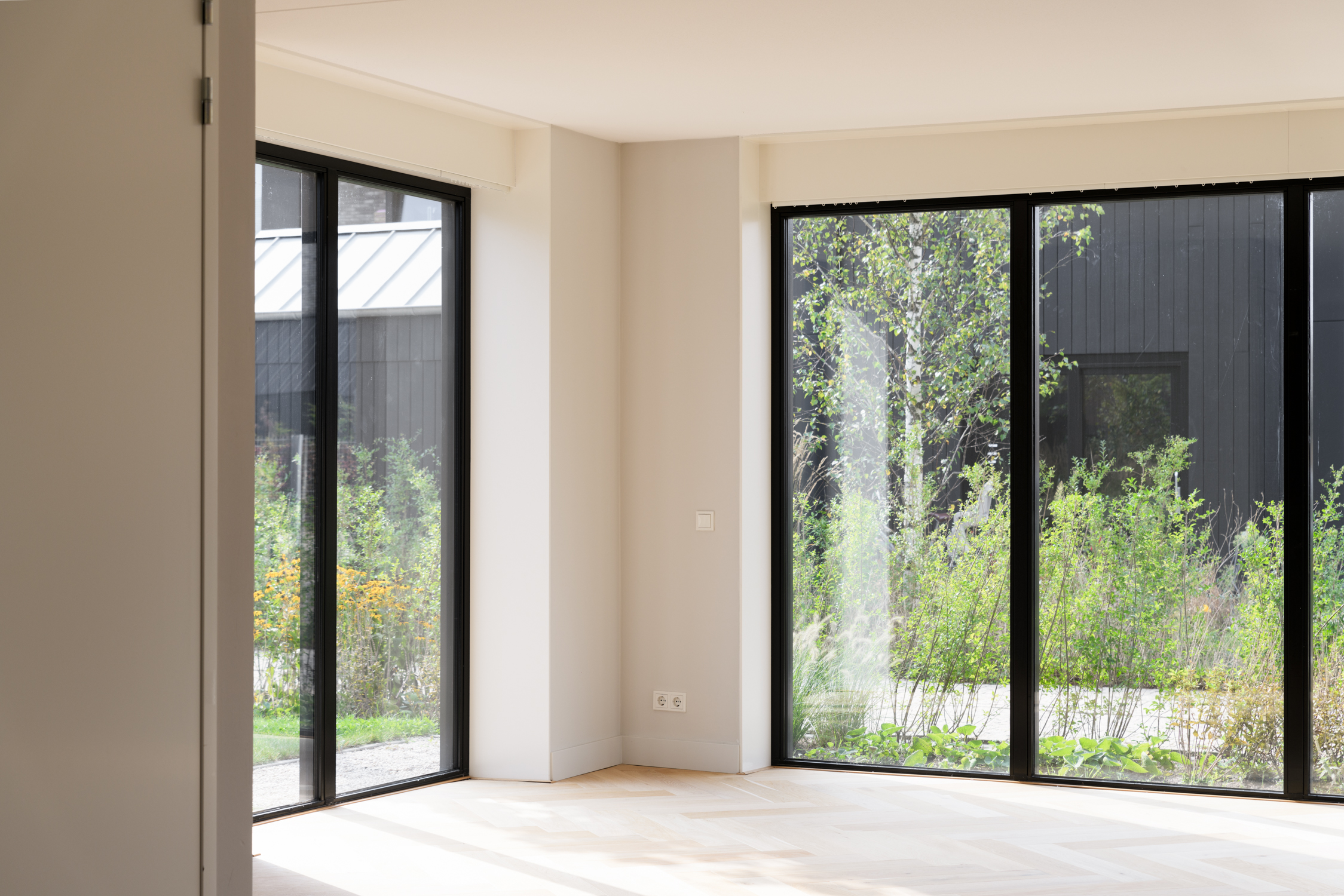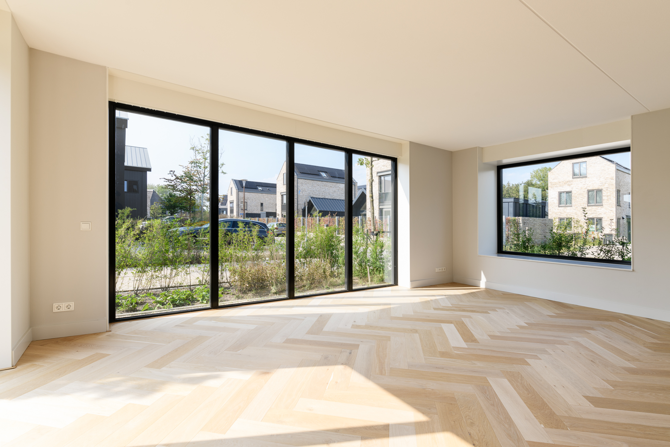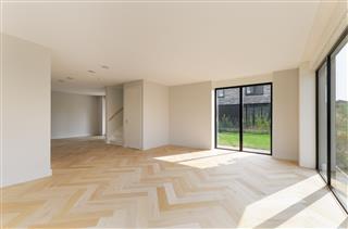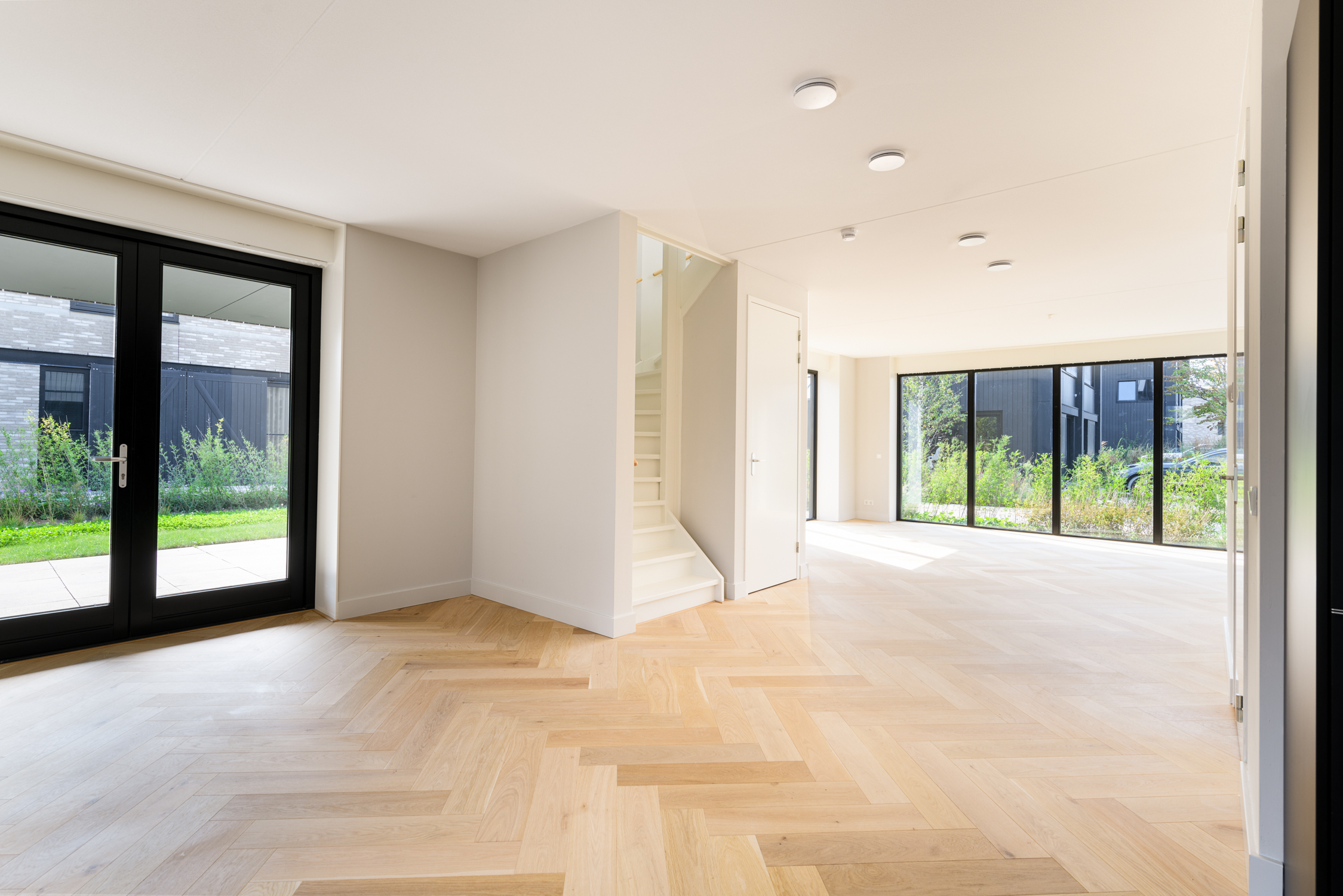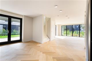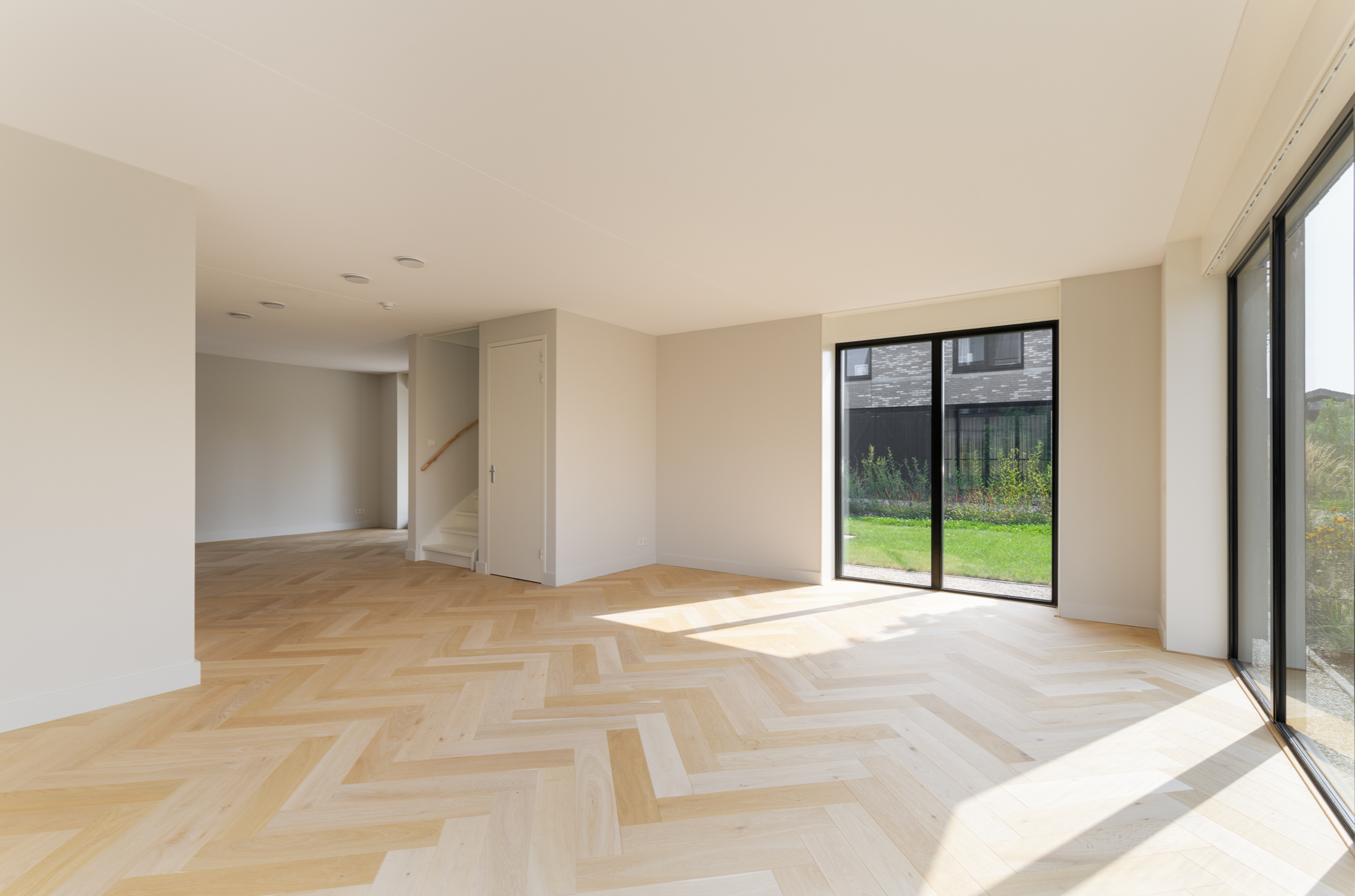 Tuingerichte woonkamer naar boven Tuingerichte woonkamer Mooie grote ramen Heerlijk ruim en licht De woonkamer van deze stijlvolle vrijstaande villa is een lichte, royale leefruimte waar comfort en elegantie samenkomen. Dankzij de hoge raampartijen tot aan de vloer geniet je hier de hele dag van natuurlijk licht. Openslaande deuren bieden direct toegang tot de zonnige tuin, wat zorgt voor een fijne verbinding tussen binnen en buiten. De prachtige houten visgraat vloer met vloerverwarming draagt bij aan het warme en luxe gevoel in huis. Als vrijstaande woning heb je bovendien aan alle zijden lichtinval, wat een ruimtelijk en open gevoel creëert. Met een eigen thermostaat per ruimte is het comfort volledig naar wens in te stellen. Hier voel je je elke dag thuis.
