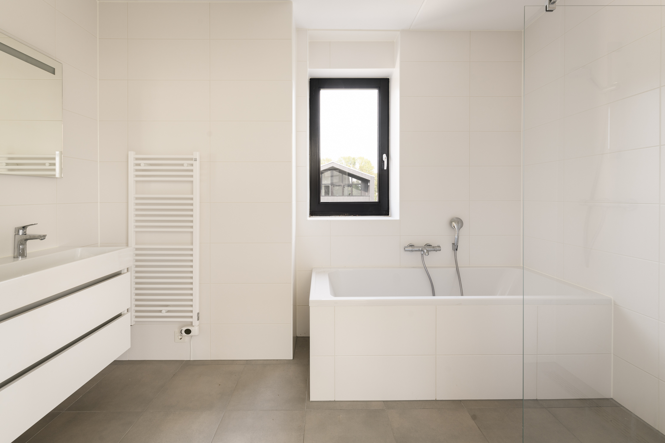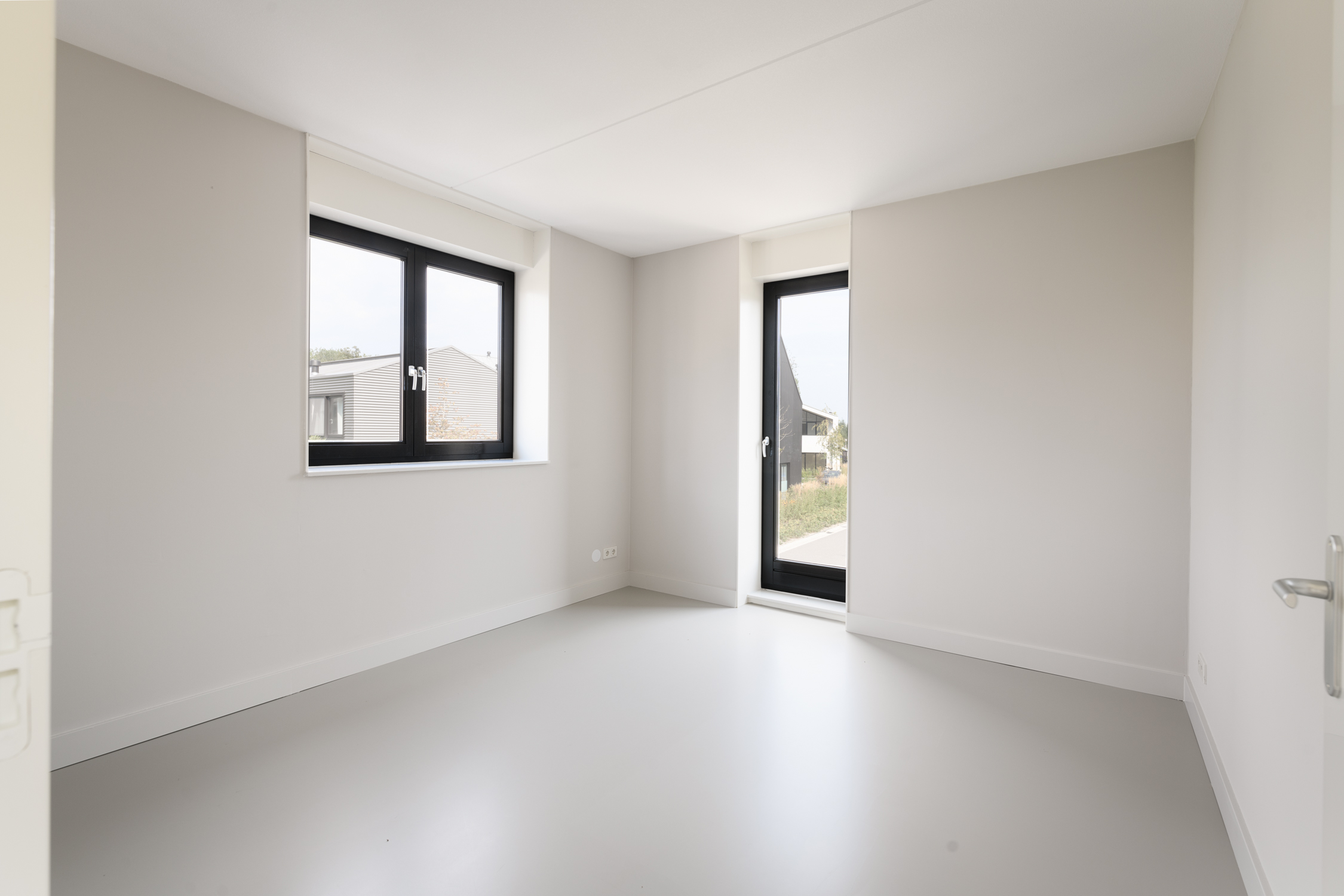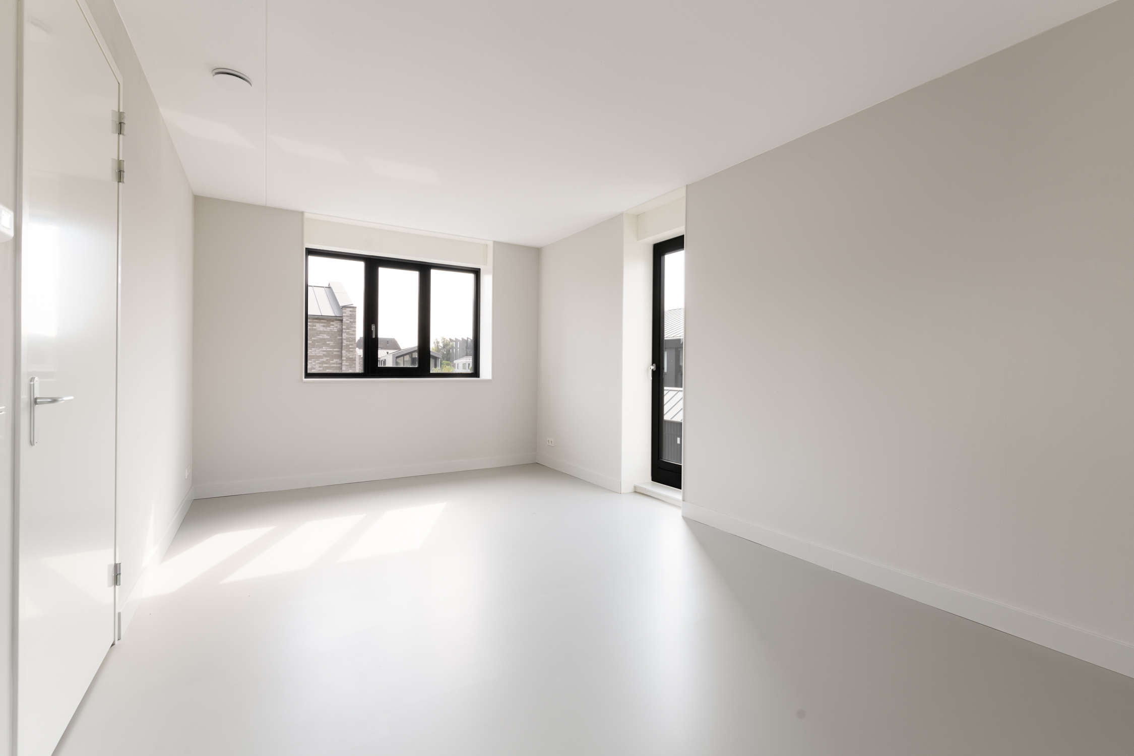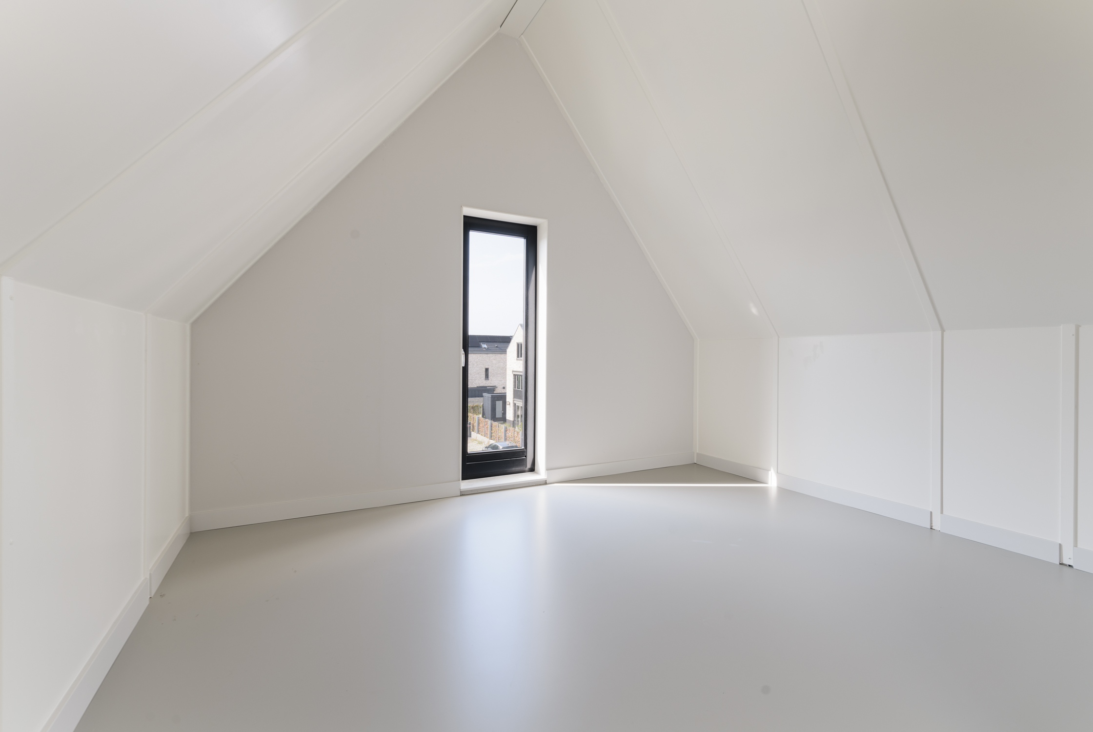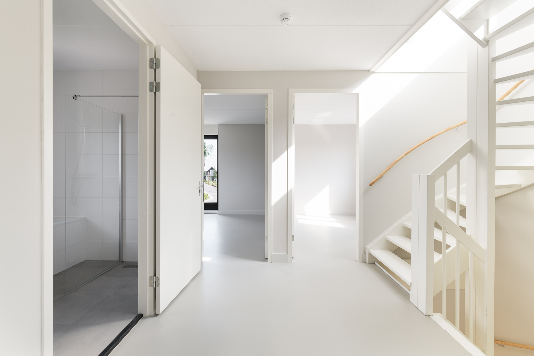 Riante slaapkamers naar boven Riante slaapkamers Stijlvolle badkamer Ruim en lichte slaapkamers De eerste verdieping biedt drie ruime, lichte slaapkamers met een moderne gietvloer en vloerverwarming. Elke kamer heeft een eigen ruimtethermostaat, zodat het comfort perfect af te stemmen is. De badkamer is uitgevoerd in een rustige, lichte kleurstelling en voorzien van een inloopdouche, ligbad en dubbel wastafelmeubel. Daarnaast is er een separaat toilet op de overloop. De tweede verdieping is verrassend ruim en biedt plaats aan nog eens twee grote slaapkamers of werkruimtes, ideaal voor gezinnen of thuiswerkers. Hier vind je ook de technische ruimte met aansluitingen voor de wasmachine, warmtepomp en WTW.