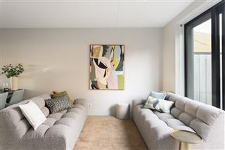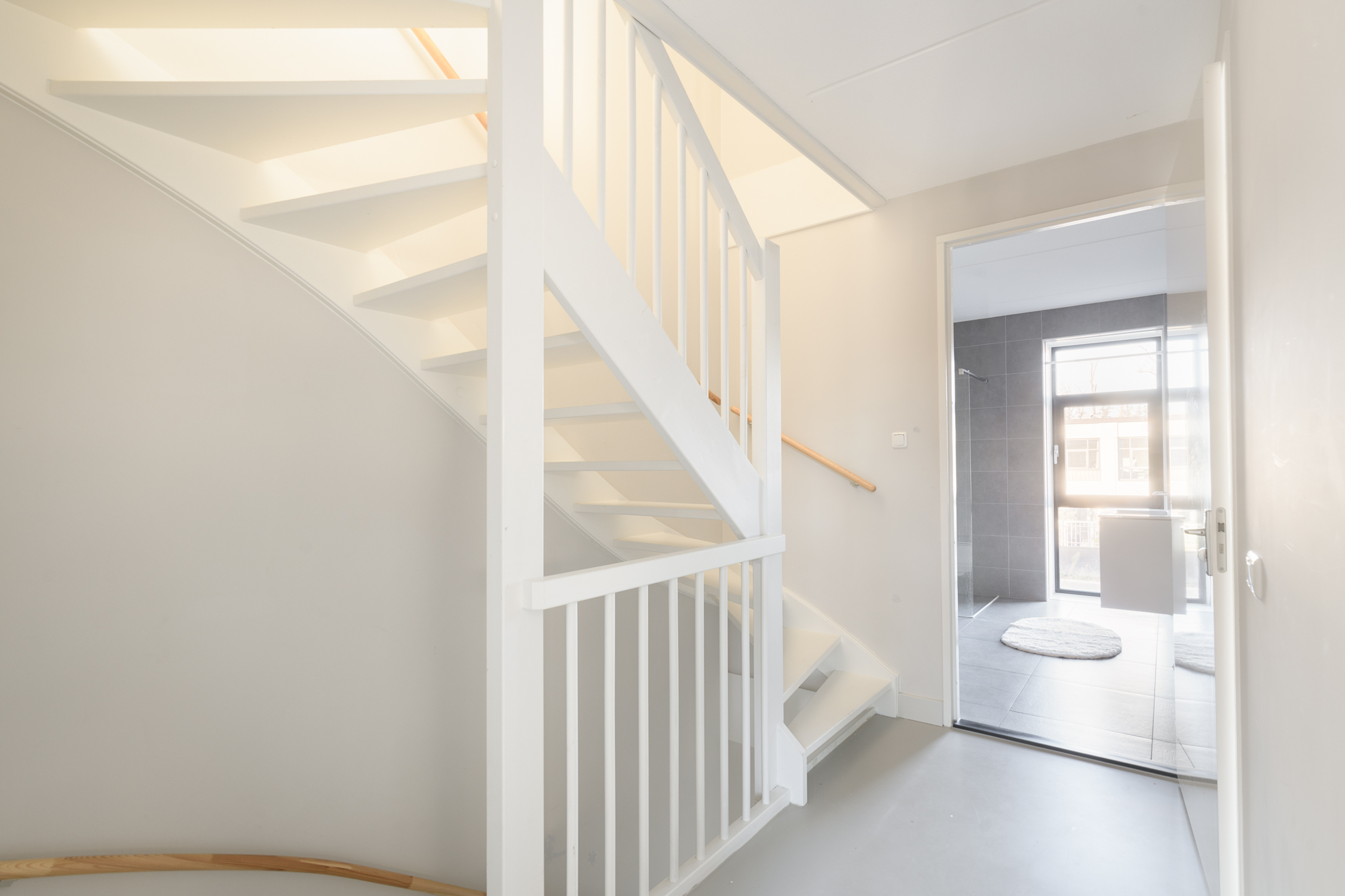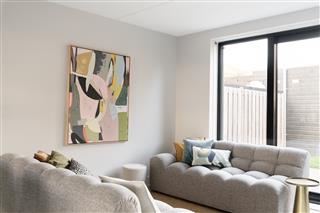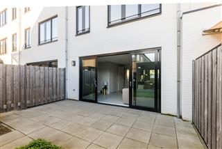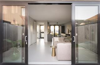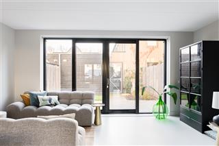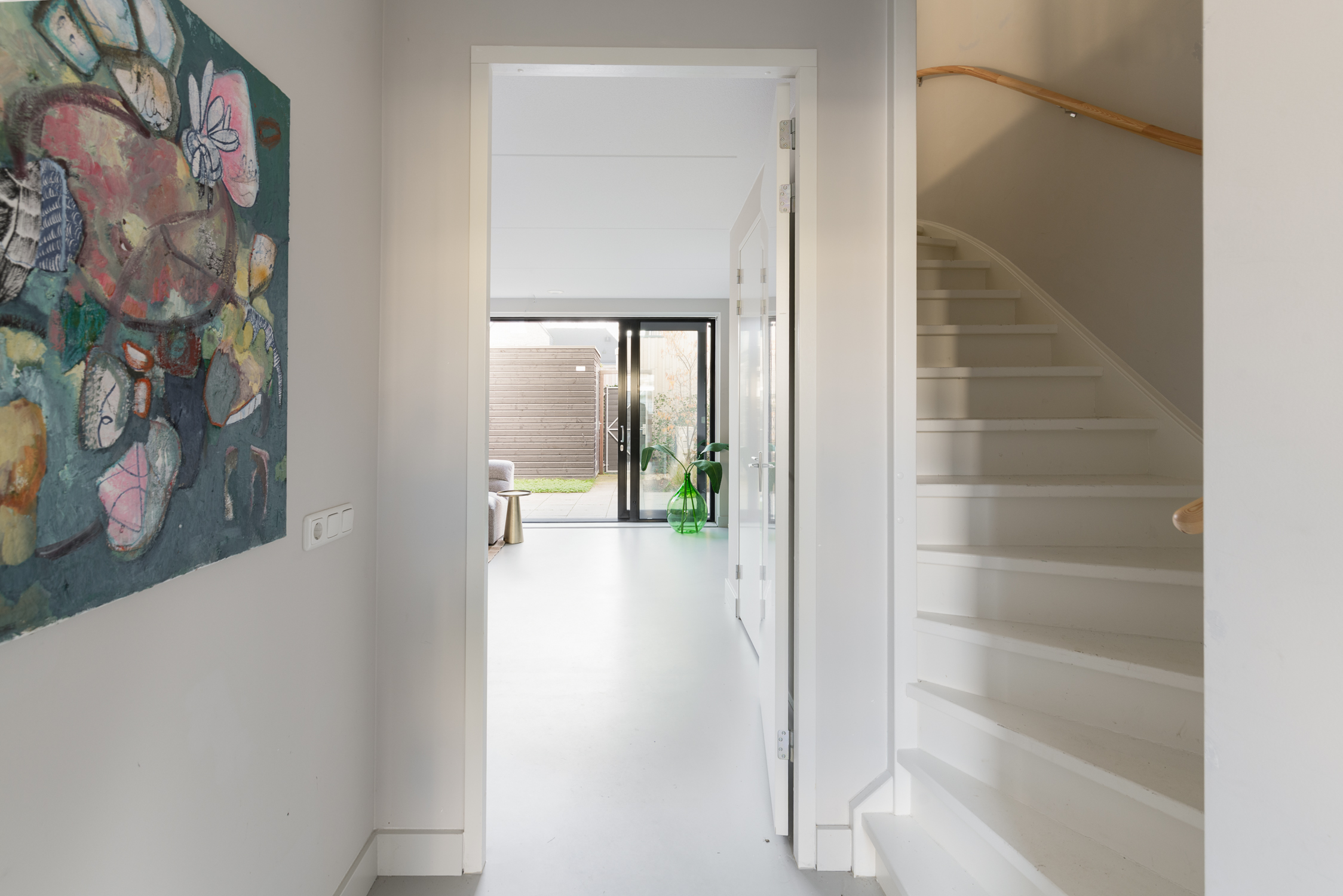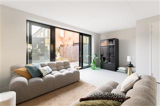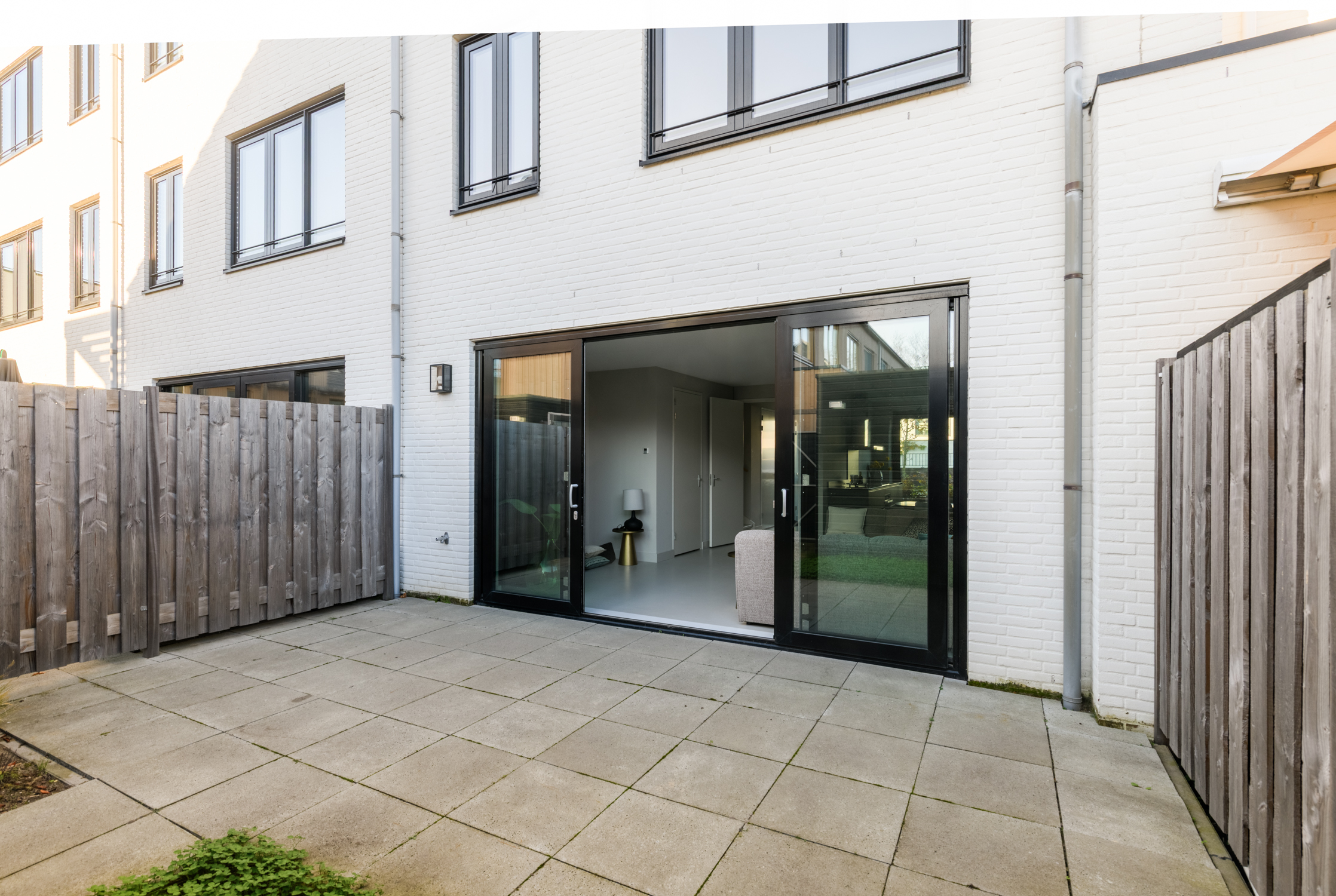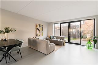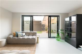 Tuingerichte woonkamer naar boven Tuingerichte woonkamer Heerlijk licht De woonkamer is het hart van de woning en ademt ruimte en licht. Dankzij de grote openslaande deuren aan de achterzijde wordt binnen en buiten naadloos met elkaar verbonden. De stijlvolle houten visgraatvloer met vloerverwarming geeft de ruimte warmte en karakter. Elk vertrek in de woning heeft een eigen thermostaat, waardoor je het klimaat per kamer regelt. De woonkamer biedt directe toegang tot de achtertuin, een heerlijke plek om te ontspannen of gasten te ontvangen.