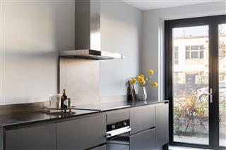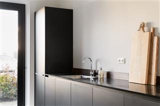 Moderne keuken naar boven Moderne keuken Diverse inbouwapparatuur De open keuken aan de voorzijde van de woning is een echte eyecatcher. Met volop werkbladruimte, veel kastruimte en hoogwaardige inbouwapparatuur is dit een keuken die uitnodigt tot koken én samenzijn. De dubbele openslaande deuren naar de voortuin zorgen voor veel licht en maken het mogelijk om in de ochtendzon te ontbijten aan je eigen zitje buiten. Deze keuken combineert functionaliteit met luxe, en vormt een perfecte balans tussen design en comfort.