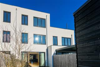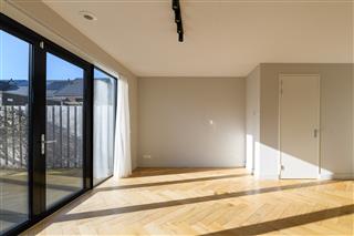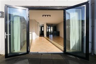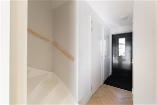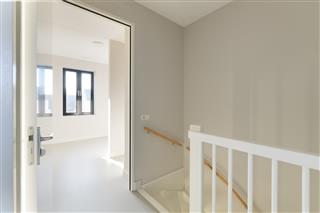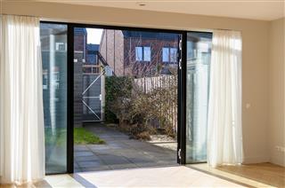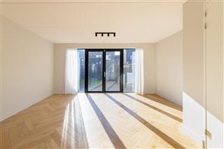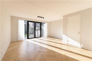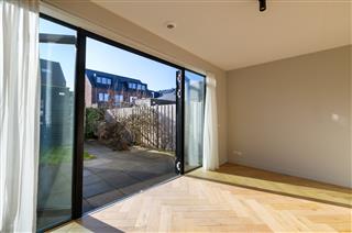 Tuingerichte woonkamer naar boven Tuingerichte woonkamer Heerlijk licht Ruim en licht! De woonkamer is het hart van de woning en ademt ruimte en licht. Dankzij de grote openslaande deuren aan de achterzijde wordt binnen en buiten naadloos met elkaar verbonden. De stijlvolle houten visgraatvloer met vloerverwarming geeft de ruimte warmte en karakter. Elk vertrek in de woning heeft een eigen thermostaat, waardoor je het klimaat per kamer regelt. De woonkamer biedt directe toegang tot de achtertuin, een heerlijke plek om te ontspannen of gasten te ontvangen.