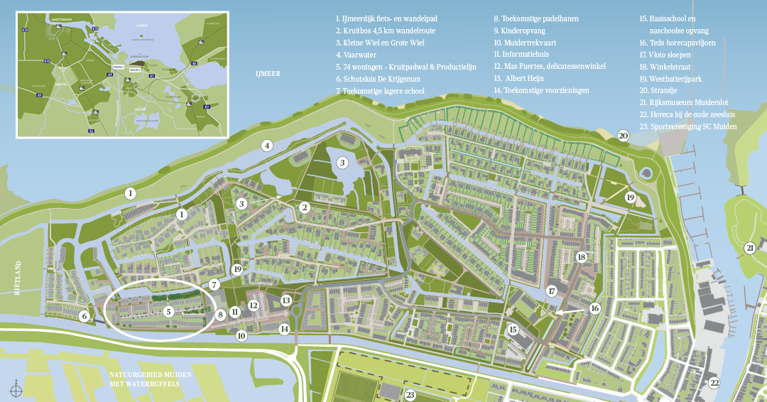 Aan de rand van de oude vesting van Muiden is een nieuw woongebied gerealiseerd: De Krijgsman Muiden. Gelegen op loopafstand van diverse winkelvoorzieningen, cafés, restaurants, de jachthavens en de sluis in de oude charmante kern van Muiden. Ook binnen De Krijgsman zijn inmiddels volop voorzieningen zoals een Albert Heijn, een basisschool, diverse winkeltjes en een restaurant en vele speelvoorzieningen en wandelroutes. Ook aan openbaar vervoer geen tekort; er rijden af en aan diverse bussen op verschillende routes en naar het dichtstbijzijnde treinstation is het 10 minuten fietsen. Kortom, een uitstekend gelegen woonwijk in de natuur, tussen het IJmeer en de Vecht, en historische gebouwen van de Stelling van Amsterdam en de kruitfabriek. Op een steenworp afstand van Amsterdam.
