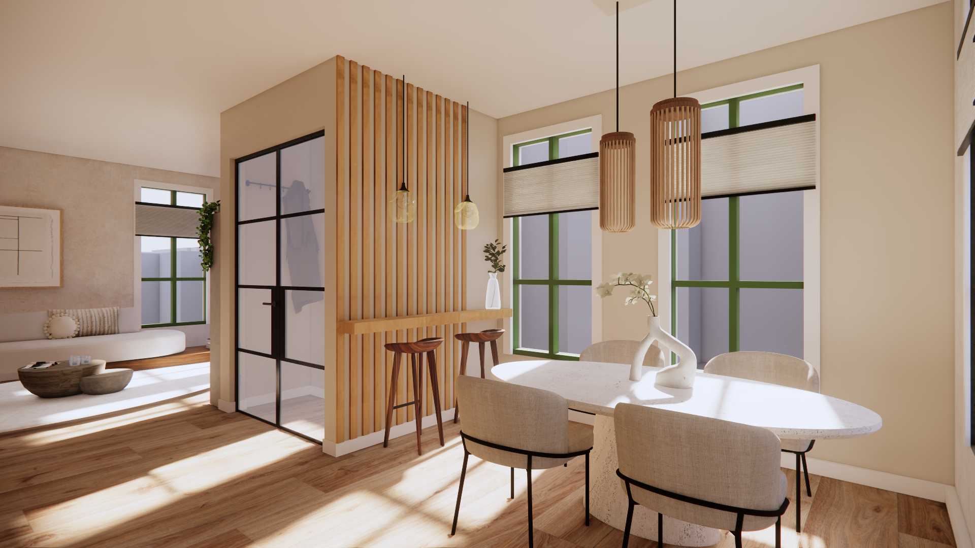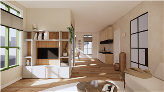 Het zogenoemde notarispand omvat drie bouwlagen. Vier appartementen worden verdeeld over de eerste en tweede etage. Op de begane grond komt een gezamenlijk gedeelte aan de achterzijde, de hoofdentree ligt aan de zijkant. De rest van de begane grond is bestemd voor een driekamerappartement met een eigen opgang. Alles gelijkvloers, heerlijk ruim en vooral heel veel lichtinval. De living met aansluitende (casco op te leveren) leefkeuken profiteert aan drie zijden van de hoge ramen met bovenlichten. De twee slaapkamers liggen hierachter, ook met de hoge ramen die het pand zo'n chique uitstraling geven.