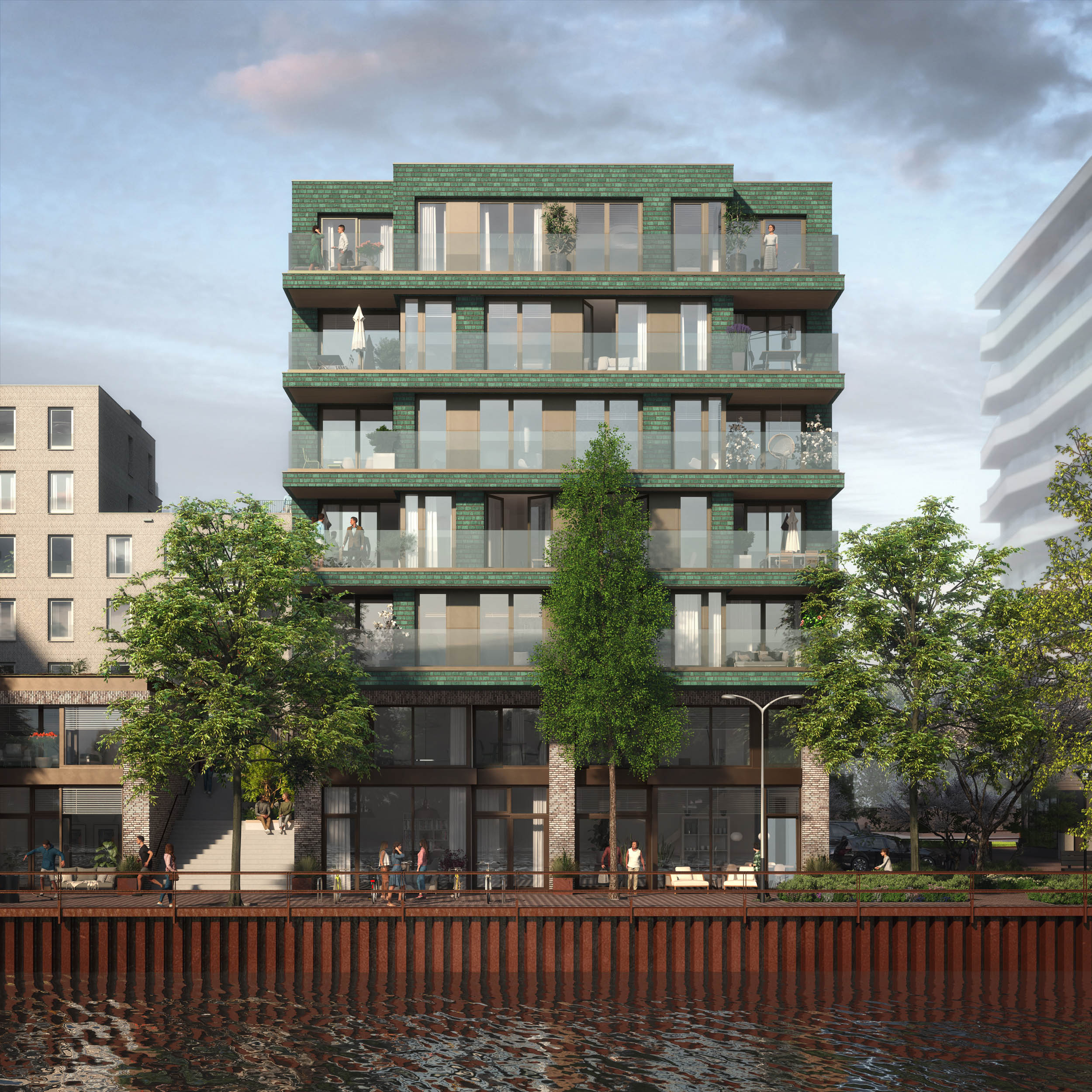 Langs de kade komen royale stadswoningen met een eigen entree aan het water. Je woont hier met het comfort van nieuwbouw, maar met het gevoel van een huis aan de gracht. De hoge plafonds, grote ramen en open leefkeuken zorgen voor een lichte en ruimtelijke woonbeleving.