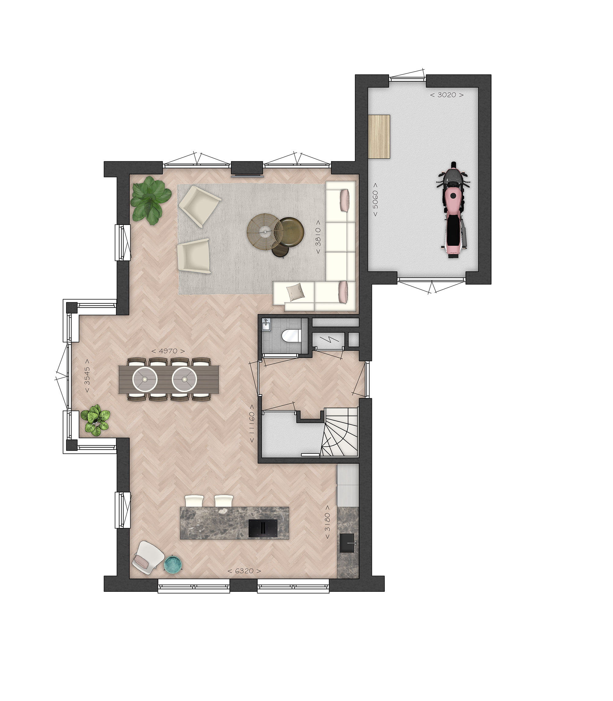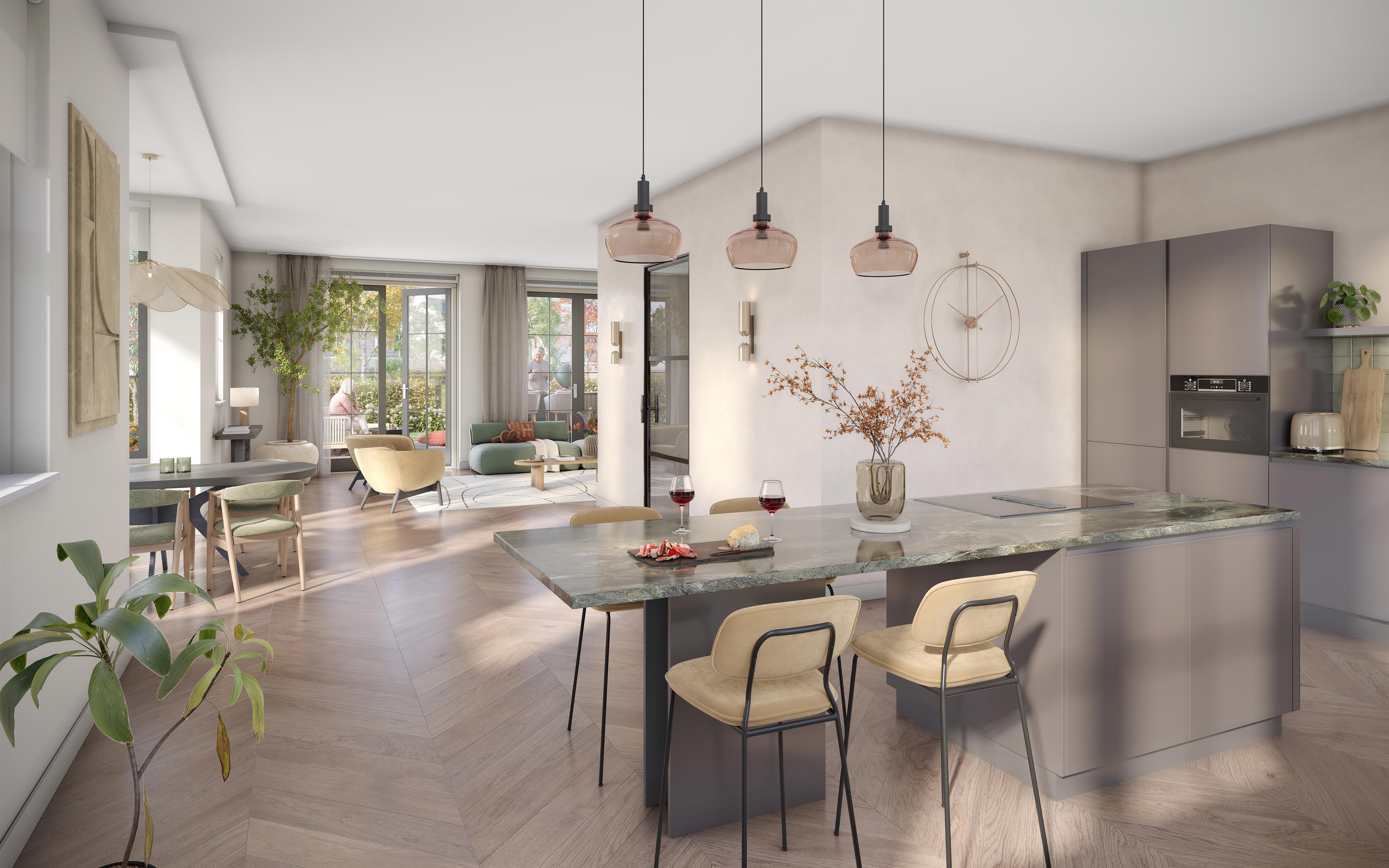 Op de begane grond vormt de leefkeuken aan de voorzijde het hart van de woning. Via de lichte en brede woonkamer met erker stap je zo het terras op: openslaande deuren verbinden binnen met buiten.