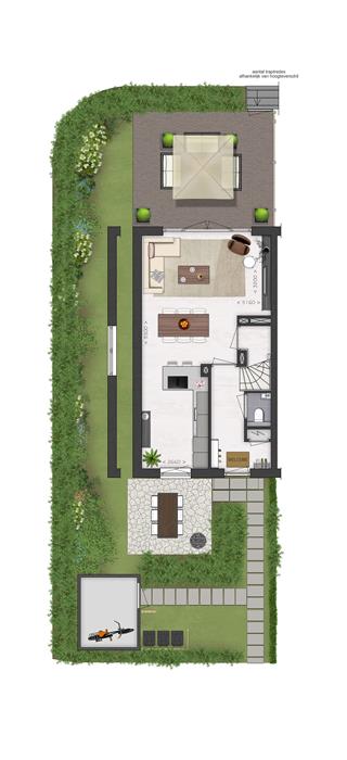 Alle woningen hebben een ruim terras met klinkerbestrating. De hoekwoningen zijn tevens voorzien van een stukje zij-tuin. De terrasafscheiding tussen de woningen bestaat uit kokoswall terrasschermen, die zorgen voor privacy en een natuurlijke uitstraling. Vanuit dit terras heb je direct toegang tot het park. Dit kun je zien als verlengstuk van je tuin.