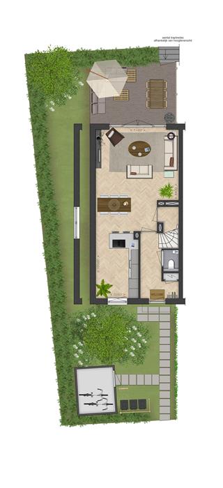 Alle woningen hebben een ruim terras met klinkerbestrating. Deze hoekwoning is tevens voorzien van een stukje zij-tuin. De terrasafscheiding tussen de woningen bestaat uit kokoswall terrasschermen, die zorgen voor privacy en een natuurlijke uitstraling. Vanuit dit terras heb je direct toegang tot het park. Dit kun je zien als verlengstuk van je tuin.