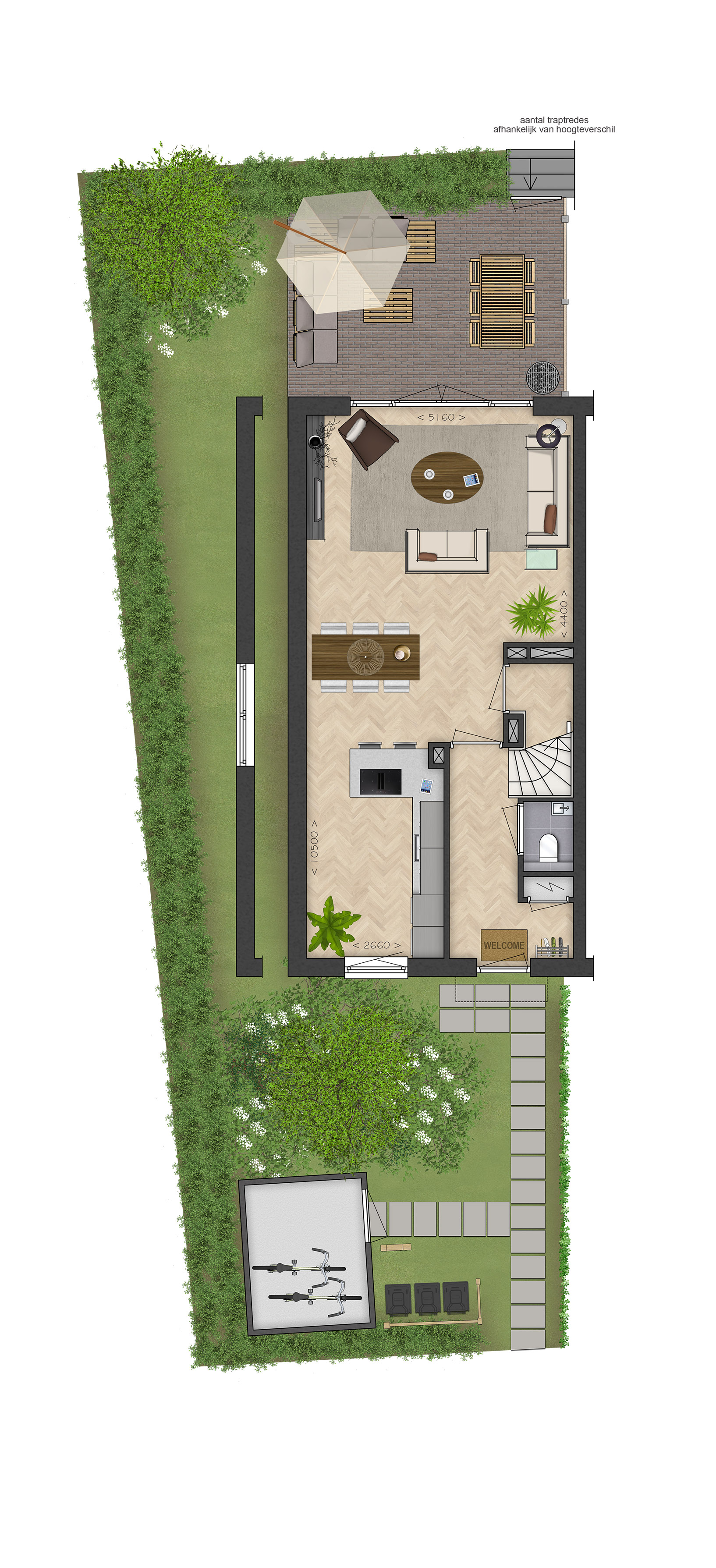 Alle woningen hebben een ruim terras met klinkerbestrating. Deze hoekwoning is tevens voorzien van een stukje zij-tuin. De terrasafscheiding tussen de woningen bestaat uit kokoswall terrasschermen, die zorgen voor privacy en een natuurlijke uitstraling. Vanuit dit terras heb je direct toegang tot het park. Dit kun je zien als verlengstuk van je tuin.