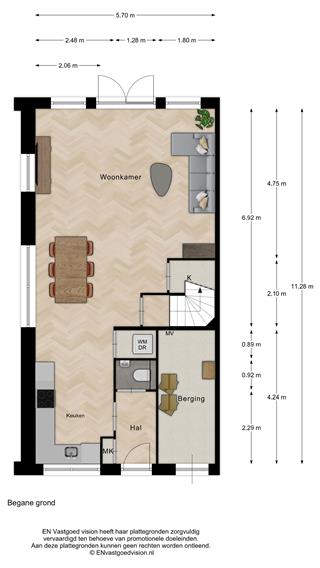 De woning is praktisch en functioneel ingedeeld, met naast de entree een handige inpandige (fietsen-)berging met technische ruimte. Op de begane grond gaan in de leefruimte de woonkamer en halfopen keuken in elkaar over. De keuken bevindt zich aan de voorzijde en wordt casco opgeleverd, zodat je deze helemaal naar eigen smaak kunt inrichten. In de keuken is een aparte wasruimte, nog meer bergruimte bevindt zich in de woonkamer, met extra berging onder de trap.
