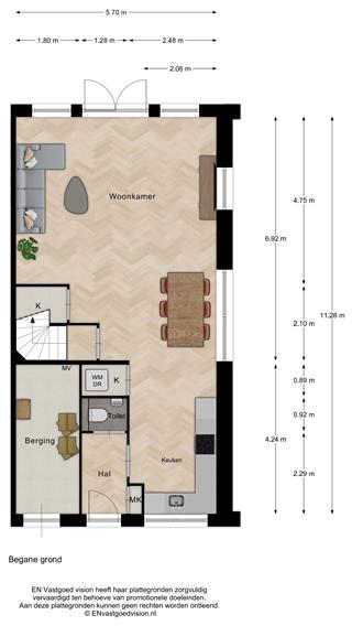 De woning is praktisch en functioneel ingedeeld, met naast de entree een handige inpandige (fietsen-)berging met technische ruimte. Op de begane grond gaan in de leefruimte de woonkamer en halfopen keuken in elkaar over. De keuken bevindt zich aan de voorzijde en wordt casco opgeleverd, zodat je deze helemaal naar eigen smaak kunt inrichten. In de keuken is een aparte wasruimte, nog meer bergruimte bevindt zich in de woonkamer, met extra berging onder de trap.