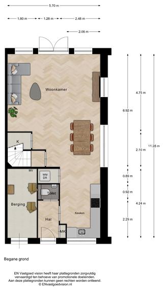 De woning is praktisch en functioneel ingedeeld, met naast de entree een handige inpandige (fietsen-)berging met technische ruimte. Op de begane grond gaan in de leefruimte de woonkamer en halfopen keuken in elkaar over. De keuken bevindt zich aan de voorzijde en wordt casco opgeleverd, zodat je deze helemaal naar eigen smaak kunt inrichten. In de keuken is een aparte wasruimte, nog meer bergruimte bevindt zich in de woonkamer, met extra berging onder de trap.