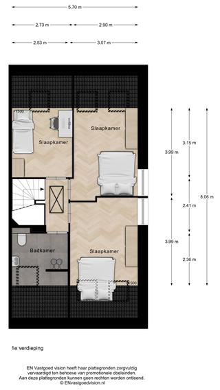 Op de verdieping liggen drie slaapkamers en een nette badkamer, met standaard een wastafel, inloopdouche en tweede toilet. De slaapkamers zijn voorzien van dakramen, twee hebben door de hoekligging dubbele lichtinval door het kamerhoge gevelraam. Een vlizotrap op de overloop leidt naar de bergvliering met stahoogte in het midden van de nok.