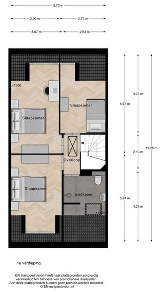 Op de verdieping liggen drie slaapkamers en een nette badkamer, met standaard een wastafel, inloopdouche en tweede toilet. De slaapkamers zijn voorzien van dakkapellen. Een vlizotrap op de overloop leidt naar de bergvliering met stahoogte in het midden van de nok.