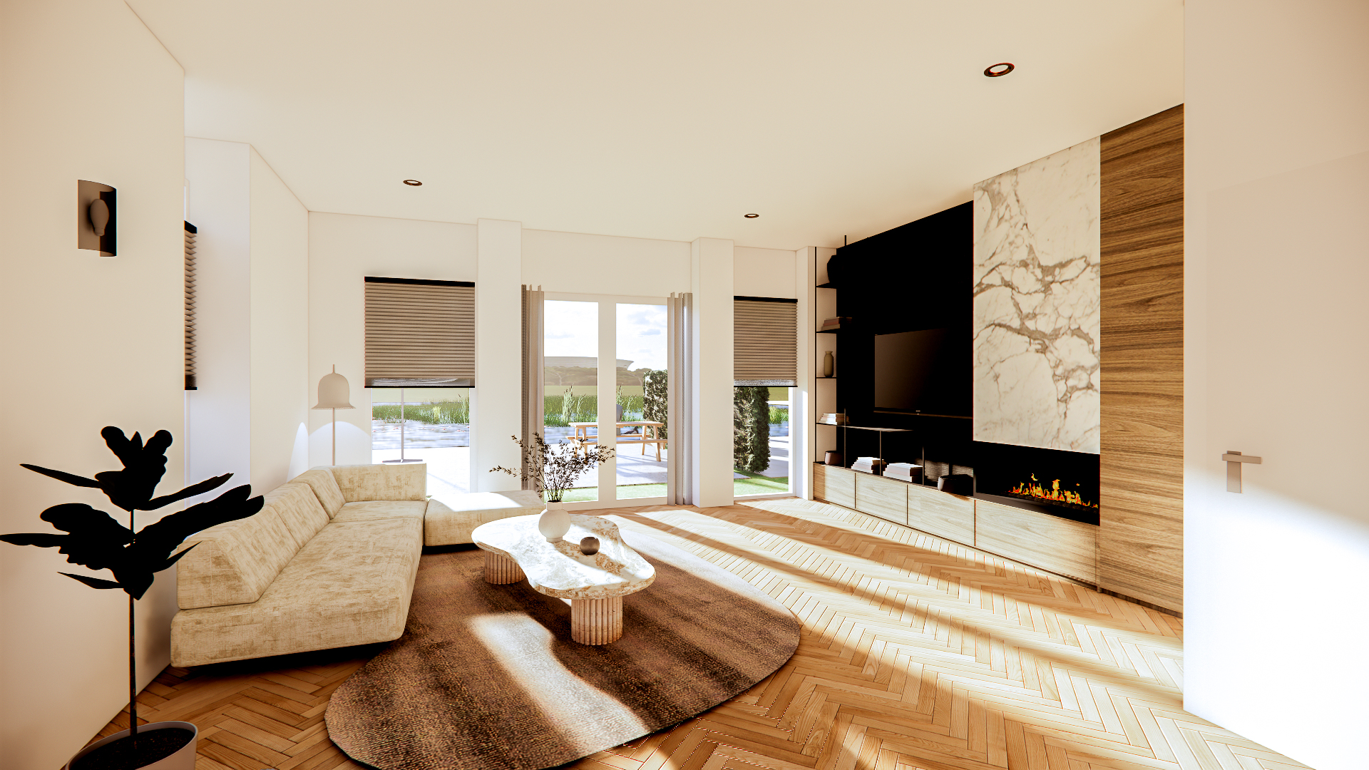 Achter de driekapper, vanaf het Zuideinde gezien, verrijst een blok van vier gezinswoningen. Ook deze woningen hebben de achtertuin aan doorgaand vaarwater. De steiger en het stukje eigen waterpartij vormen een rijk bezit voor het hele gezin. Dit staat garant voor het hele jaar waterpret. Stap op de sup, in een bootje of - wie weet - op de schaats. Gewoon vanaf huis!