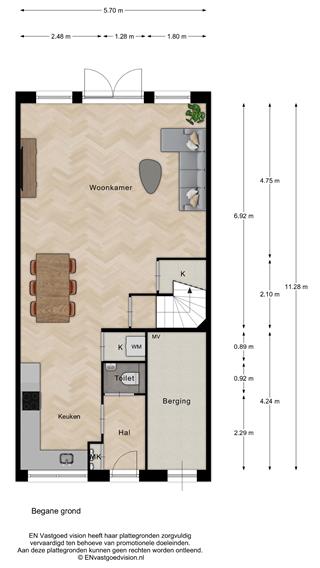 Begane grond: entree met hal. Meterkast. Betegelde toiletruimte met wandcloset en fontein. L-vormige leefruimte met woonkamer aan de achterzijde en keuken aan de voorzijde. Deze wordt casco opgeleverd, met voorbereid leidingwerk. Gesloten wasruimte met aansluitingen wasmachine en -droger. De living heeft dubbele openslaande deuren naar de achtertuin op het zuiden.