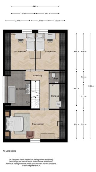 Op de verdieping komen drie royale slaapkamers, waarvan de hoofdslaapkamer zich aan de voorzijde over de hele woningbreedte uitstrekt, met aan weerszijden dakramen. Een mega badkamer biedt ruimte voor een dubbele wastafel, ligbad én aparte inloopdouche. Het tweede toilet heeft een eigen plek op deze verdieping.