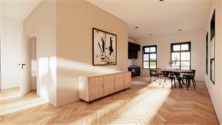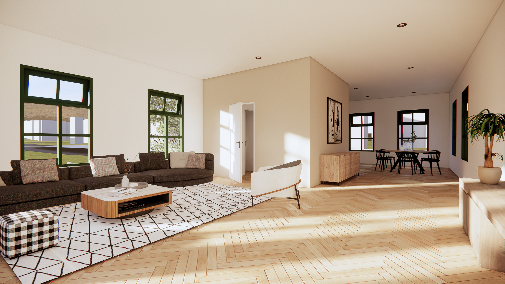 Open leefruimte met woonkamer achter en eetkeuken aan de straatkant. De leefkeuken wordt casco opgeleverd, met voorbereid leidingwerk. De living oriënteert op de achtertuin en de waterkant. Dubbele openslaande deuren en raampartijen aan alle kanten zorgen voor een lichte en ruimtelijke sfeer.