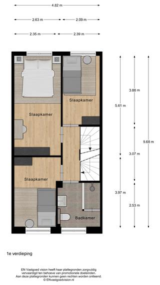 Eerste verdieping: overloop met vaste trap naar tweede verdieping. Drie slaapkamers en badkamer, standaard voorzien van betegeling, wastafel en inloopdouche.