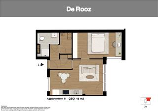 Dit appartement bevindt zich op de tweede verdieping aan de achterzijde van het entreegebouw. Het appartement ligt beschut achter de lichthof, waar ook de galerij is met de voordeur. Daarnaast ligt de badkamer annex toiletruimte. Deze wordt geheel betegeld en standaard uitgerust met Villeroy & Boch sanitair en A-merk kranen. Hier wordt warmte terugwinning (wtw) opgenomen bij de inloopdouche. Ook deze woning heeft een inpandige berging met aansluitingen voor de wasmachine en -droger plus een conventionele CV-installatie. Uiteraard zijn isolatie, ventilatie en installaties conform de moderne bouweisen. De slaapkamer heeft een schuifpui met transparant Frans balkon op het zuidwesten. Ook de woonkamer heeft dergelijke Franse balkons, om in huis optimaal van de zuidzon te kunnen genieten. Alledrie de glazen deuren kunnen kantelen en draaien. De keuken wordt casco opgeleverd, het benodigde leidingwerk wordt natuurlijk voorbereid. De hele woning wordt voorzien van vloerverwarming.